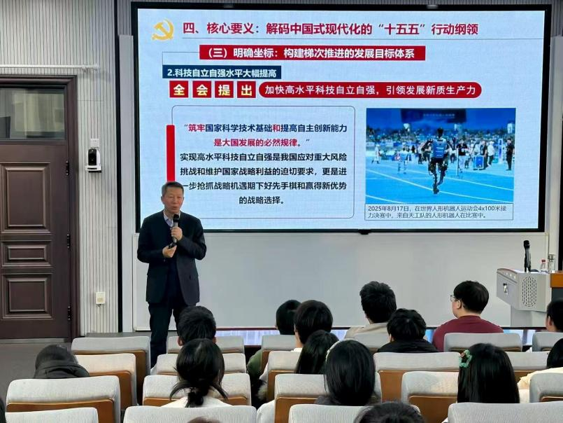 学校党委始终将思政课摆在铸魂育人的核心位置抓实抓好,通过建立并严格落实校领导常态化讲授思政课的制度,推动领导干部深入教学一线,将党的创新理论、政策部署与鲜活社会现实、校史校情紧密结合,着力推动“思政小课堂”与“社会大课堂”深度融合,既夯实理论根基,又引导学生关注时代、深入实践,努力构建全员参与、全程贯通、全方位协同的“大思政课”育人格局,切实提升育人实效。
