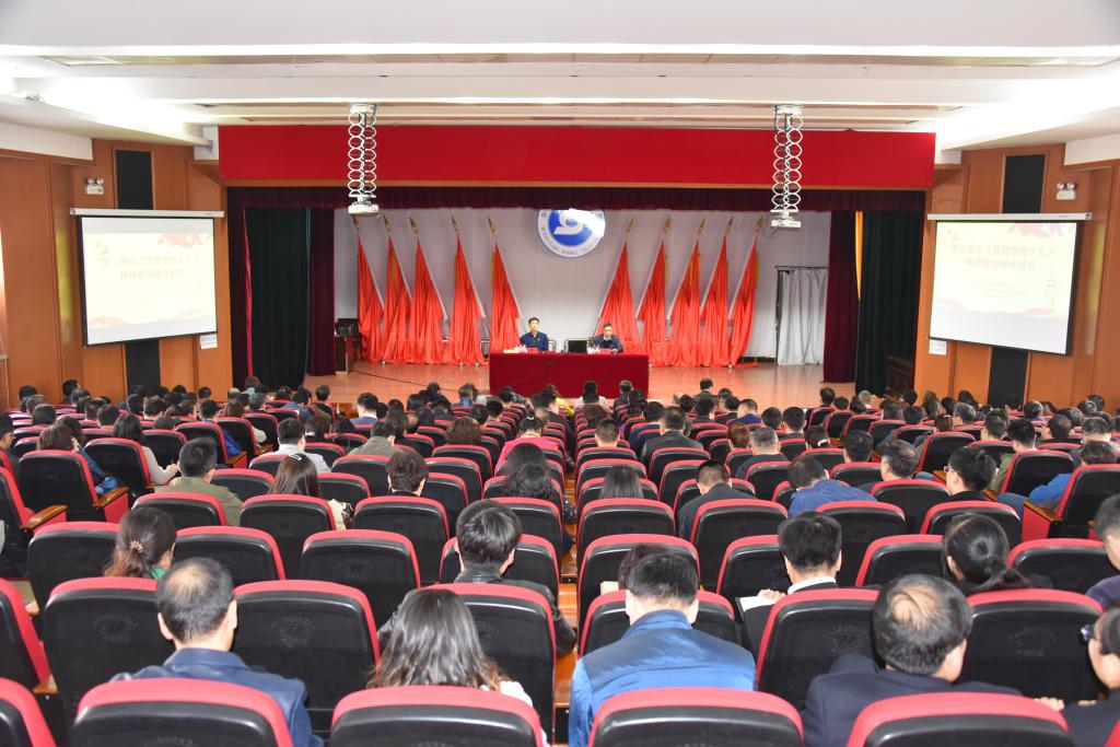 4月17日下午,学校在春秋讲坛举行第3期学习贯彻党的十九大精神轮训班第一次专题培训。全校处、科级干部;党支部书记;系部主任共计260余人参加培训。专题培训由校党委常委、组织部长张冬主持。
