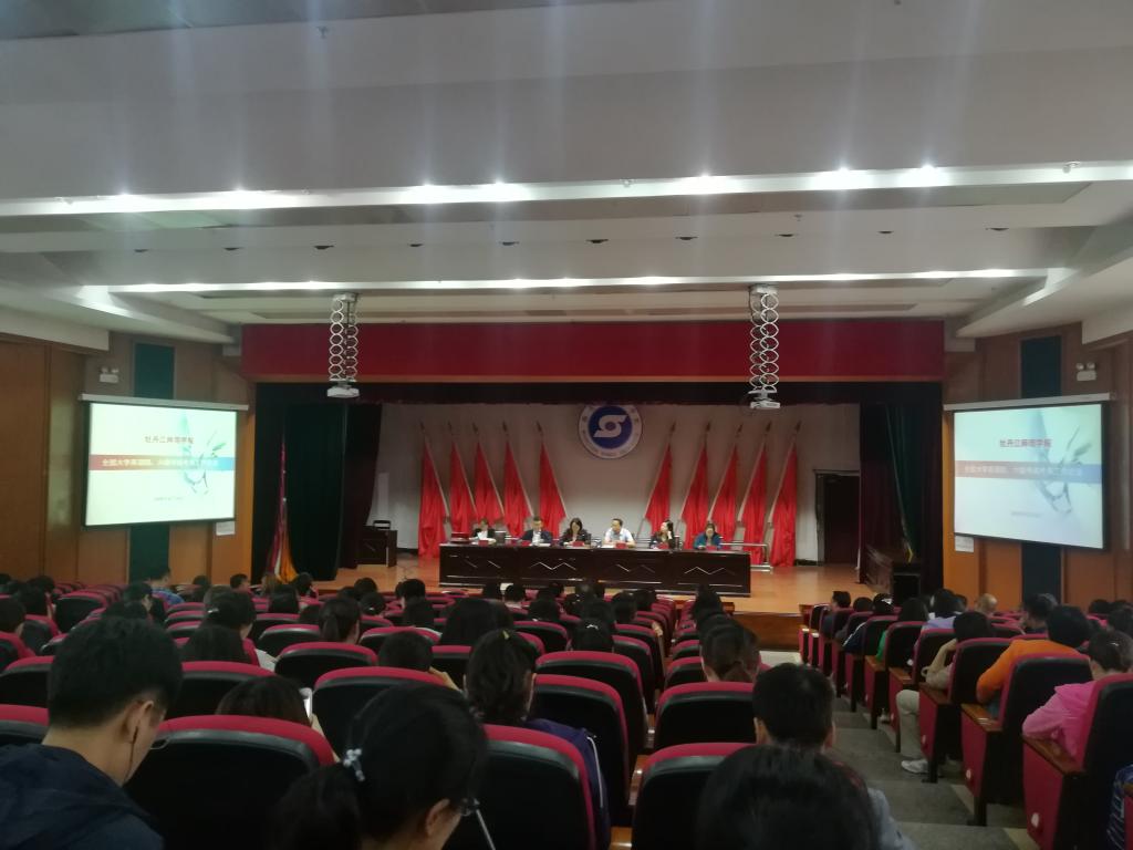 6月14日下午,学校在春秋讲坛召开了2018年上半年全国大学英语四、六级考试考务工作会。校长梁中贤、纪委书记刘峰出席会议,各教学单位的教学副院长、全体无课监考教师、巡考人员及教务处全体人员共计近三百人参加了会议。会议由教务处处长周传胜主持。
