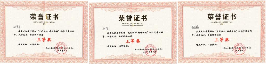 近日,由黑龙江省高等学校图书工作委员会主办的中科杯“文化润心精神铸魂”全省大学生知识竞赛决赛在哈尔滨师范大学图书馆圆满落幕,全省共有39所学校21700余人参赛,我校代表队荣获团体“三等奖”,学校荣获“最佳组织奖”。
