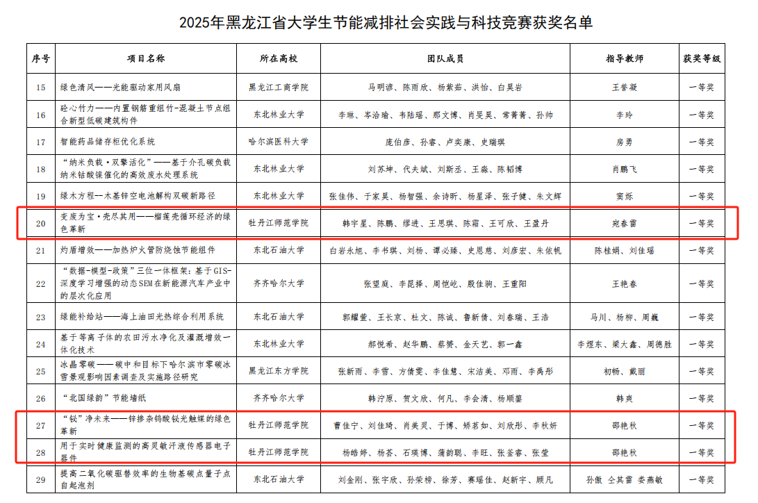 近日,黑龙江省大学生节能减排社会实践与科技竞赛在黑龙江东方学院圆满落下帷幕。经过激烈角逐,我校参赛队伍荣获省赛一等奖3项。