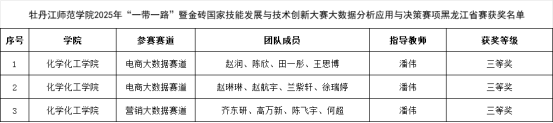 近日,2025年“一带一路”暨金砖国家技能发展与技术创新大赛之大数据分析应用与决策赛项黑龙江省赛圆满结束。经过激烈角逐,最终荣获三等奖3项。学校荣获优秀组织奖。