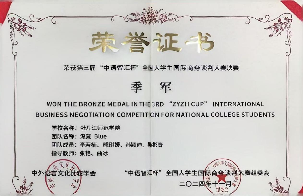 近日,第三届“中语智汇杯”全国大学生国际商务谈判大赛全国总决赛圆满落下帷幕。经过激烈的角逐,由我校应用英语学院商务英语专业及翻译专业学生组成的两支参赛队伍在本次大赛中表现优异,最终荣获全国季军,展现了我校学子在国际商务谈判领域的卓越才能和团队协作精神。应用英语学院韩雪、张蔚、张艳和曲冰四位老师荣获“优秀指导教师”荣誉称号。