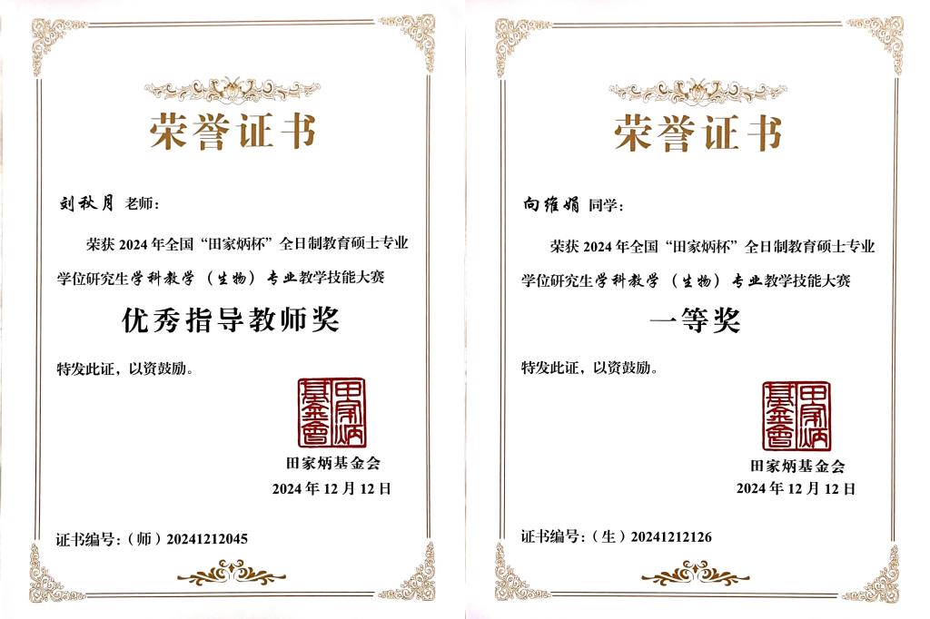 近日,全国“田家炳杯”全日制教育硕士专业学位研究生学科教学(生物)专业教学技能大赛决赛圆满落幕,我校生命科学与技术学院学科教学(生物)专业2023级研究生向维娟荣获全国总决赛一等奖,刘秋月老师荣获优秀指导教师奖。