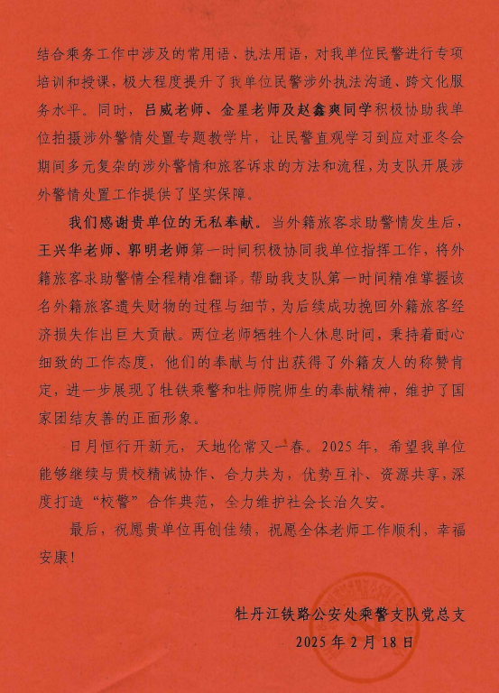近日,学校收到来自牡丹江铁路公安处乘警支队党总支的一封感谢信,信中对我校东方语言学院党委、西方语言学院党委与乘警支队党总支在“助力亚冬 双向赋能”联创共建主题活动中给予的支持与协助表示诚挚感谢。我校师生在亚冬会期间与牡铁乘警密切配合,充分利用自身的专业优势,确保各项工作的有序推进。今后,学校将此次合作的成功经验推广应用到更多的领域和场景中,不断创新工作模式,为维护社会安全稳定贡献更多力量。