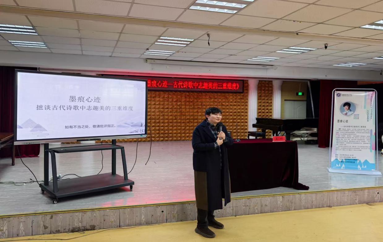 讲座特别邀请了荣获2024年词曲中国精品工程铜奖作品《传奇牡丹江》的词作者、毕节市第一中学高中语文教师、贵州省教学设计一等奖获得者、民建毕节市工委市直四支部会员姜竹。姜竹老师创新性地将古代诗歌志趣美分为三重维度。并结合声乐诗词作品,生动阐释了物象寄情、抒发哲思、精神升华的独特魅力,让师生们多元立体地感知到了音乐与诗词融合的艺术魅力。与会人员认真听取了讲座,并在互动环节积极提问,姜老师与同学们分享了其创作《传奇牡丹江》的灵感与创作思路,让在场师生深受启发。