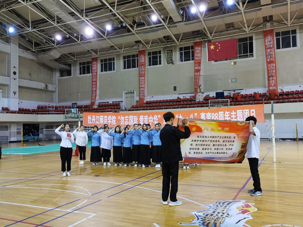 主题团日在雄壮的国歌声中拉开帷幕,体育科学学院2018级体育教育班团支部以“勿忘国耻 爱我中华”为主线贯穿整场主题团日活动,他们依次展示了体育学生的日常训练、英姿飒爽的擒敌拳表演、振聋发聩的《少年中国说》以及特色鲜明的主题演讲,活动在全体团员青年重温入团誓词中结束。