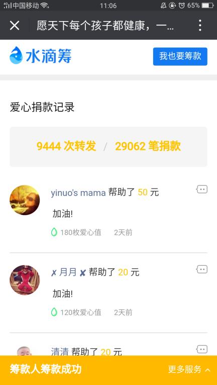 宋须眉:彻夜难眠,不是因为水滴筹款的额度,而是因为水滴筹过程给孩子带来的人生证悟------妈妈,我以前是不是太不自信了?妈妈,我以前是不是太自私了?妈妈,我以前是不是太狭隘了……沉痛的反思,比任何说教都有效!我的新我对这个世界和自己的生命,忽然间,有了一个更深的认识和理解,他长大了,走出了小我,突变成大我;他坚毅了,对战胜病魔充满了必胜的信念!这是作为母亲,作为教师最希望看到的结果!