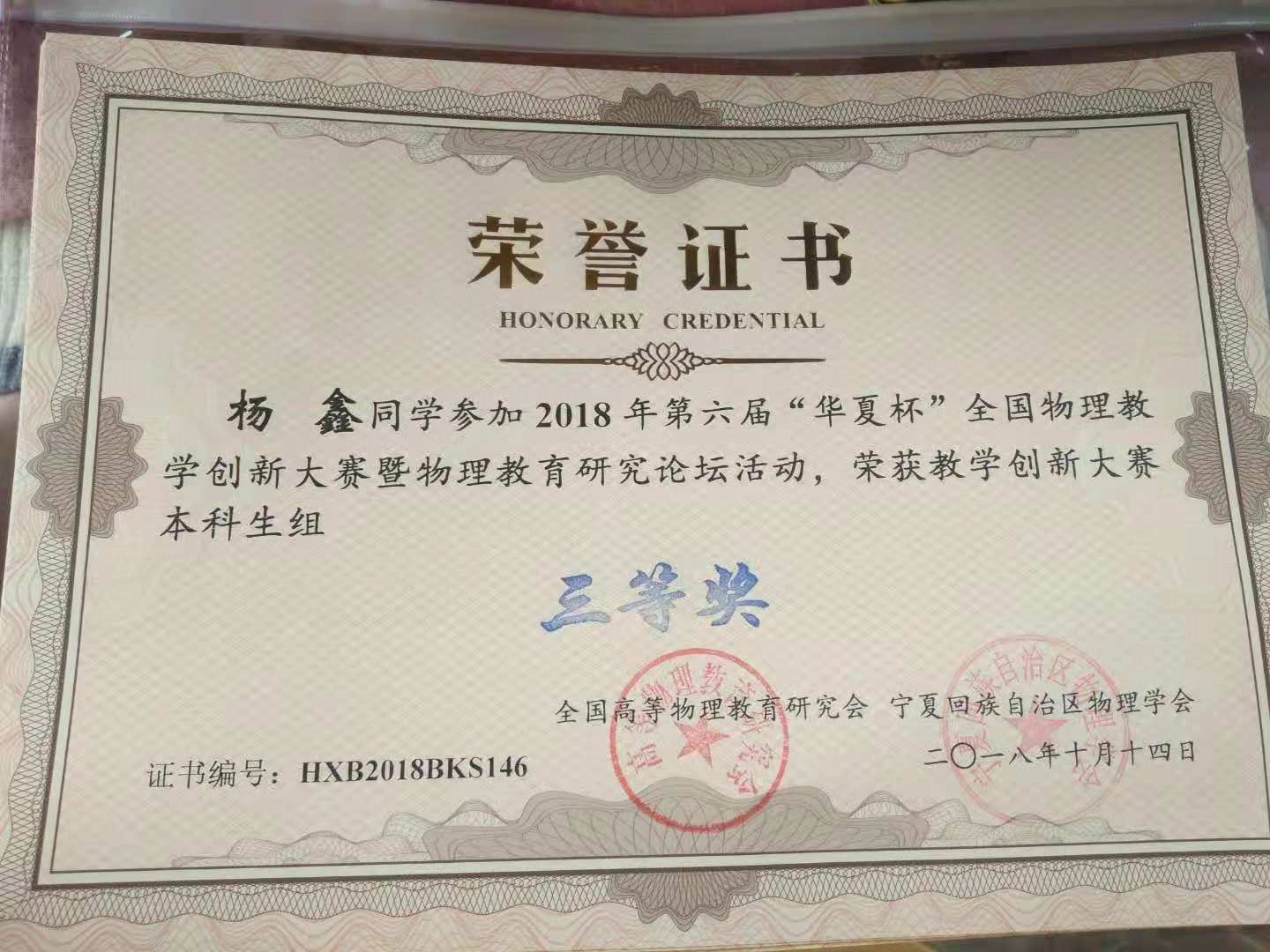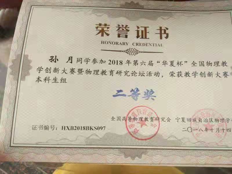 10月13日,由高等物理教育研究会主办,宁夏大学承办的第六届“华夏杯”全国物理教学创新大赛在银川宁夏大学举行,来自全国28个省、市、自治区的57所高校、51所中学共476位代表及选手参赛。我校物理与电子工程学院学生孙月、姚佳运、杨鑫等三人,在教师吴同华、陈薇薇、胡巍的指导下,分获本科组全国二等奖、三等奖。
