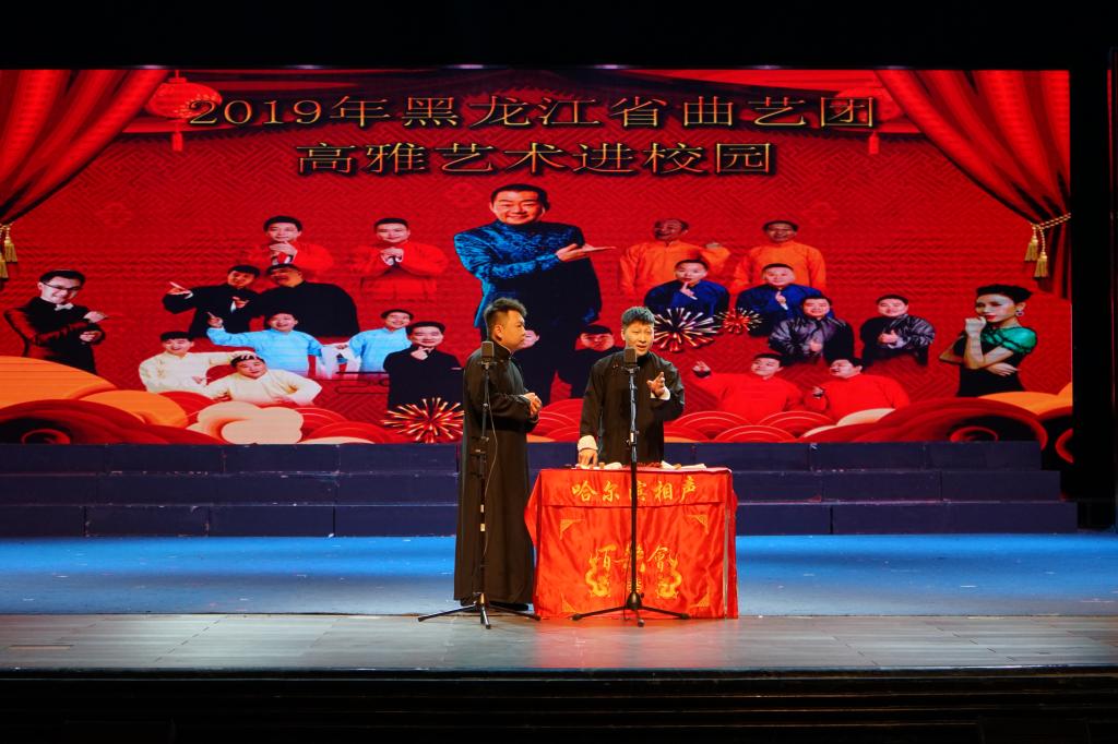 演出开始,黑龙江省曲艺团的相声演员讲述了相声的起源与发展,向观众展现了相声文化与时俱进、开拓创新的内涵。随后,《中华曲库》《绕口令》《恋爱潮人》《超级模仿》《文学家》等精彩的节目接连登场,现场掌声连连,笑声不断。黑龙江省曲艺团演出人员精湛的艺术水平,为师生们献上了一场视听盛宴,到场师生深切感受到了传统艺术的无穷魅力。