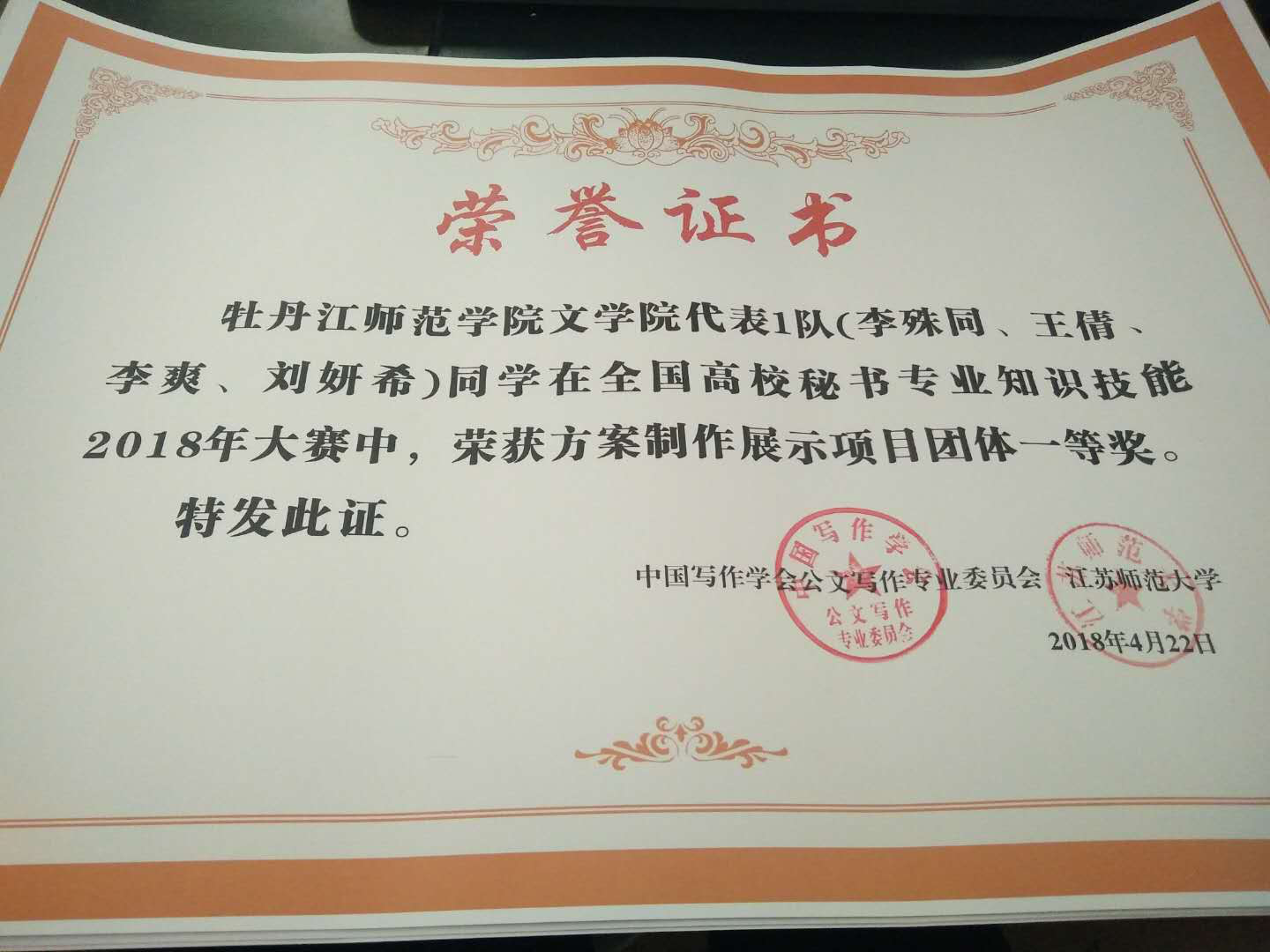秘书学系派出了由李殊同、王倩、李爽、刘妍希四位同学组成的代表队,在系主任冯岩老师的带领指导下,沉着应战、稳定发挥,最终勇夺方案制作团体一等奖;同时,李爽、刘妍希同学荣获职业形象与素养比赛项目二等奖,王倩同学荣获秘书基本技能比赛项目二等奖,秘书学系系主任冯岩获得了全国高校秘书专业知识技能2018年大赛优秀指导教师称号。