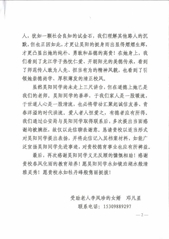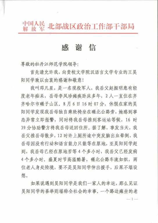 8月6日16时07分,在齐齐哈尔市碾子山区碾北公路旁,文学院王昊阳同学在路边发现了一位瘫坐在轮椅上的老人,并把她送到客运站,而后及时与警方联系帮助老人回家。据悉,8月6日,老人赵振明带妻子李凤珍出门散步,中午12时许赵振明老人上厕所途中突发脑溢血晕倒,而李凤珍老人又没有行动和言语能力,至王昊阳同学发现,老人已在原地等待了近四个小时。碾山公路旁车流不息,两位老人身处险境,情况危急,王昊阳同学的及时发现,使两位老人幸免于难。事后,老人的家属送来了感谢信,向王昊阳同学表达了深深的谢意。王昊阳同学表示觉得自己并没有做什么,很多时候,好人好事可能只是人与人之间一些很寻常的关怀。也许坐在路边的老奶奶需要一点帮助,他也只是尽他之力,做了许多人都会做的事。