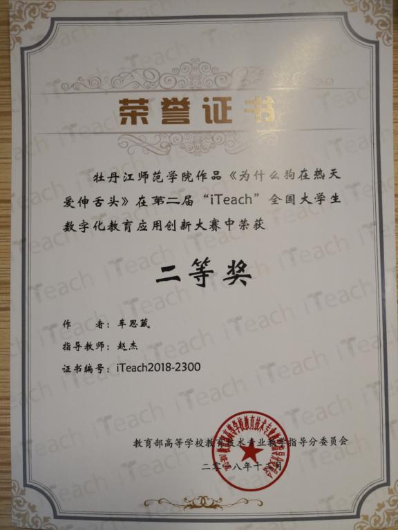 12月2日,第二届科大讯飞杯“iTeach”全国大学生数字化教育应用创新大赛在华中师范大学圆满落下帷幕。来自65所院校的272个作品参与现场决赛,我校教育科学学院2016级教育技术学专业学生车思葳荣获二等奖。
