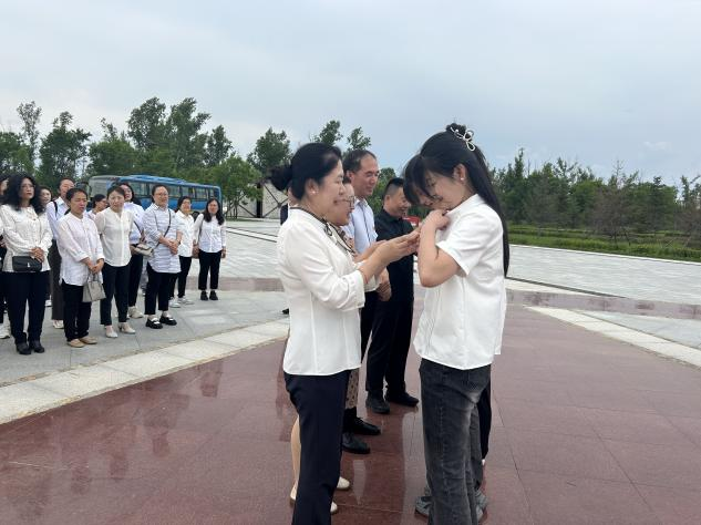 在东北老航校旧址红色教育基地启航广场,西方语言学院党委书记佟亚辉带领全体党员重温入党誓词,学院领导班子为新发展党员佩戴党员党徽。
