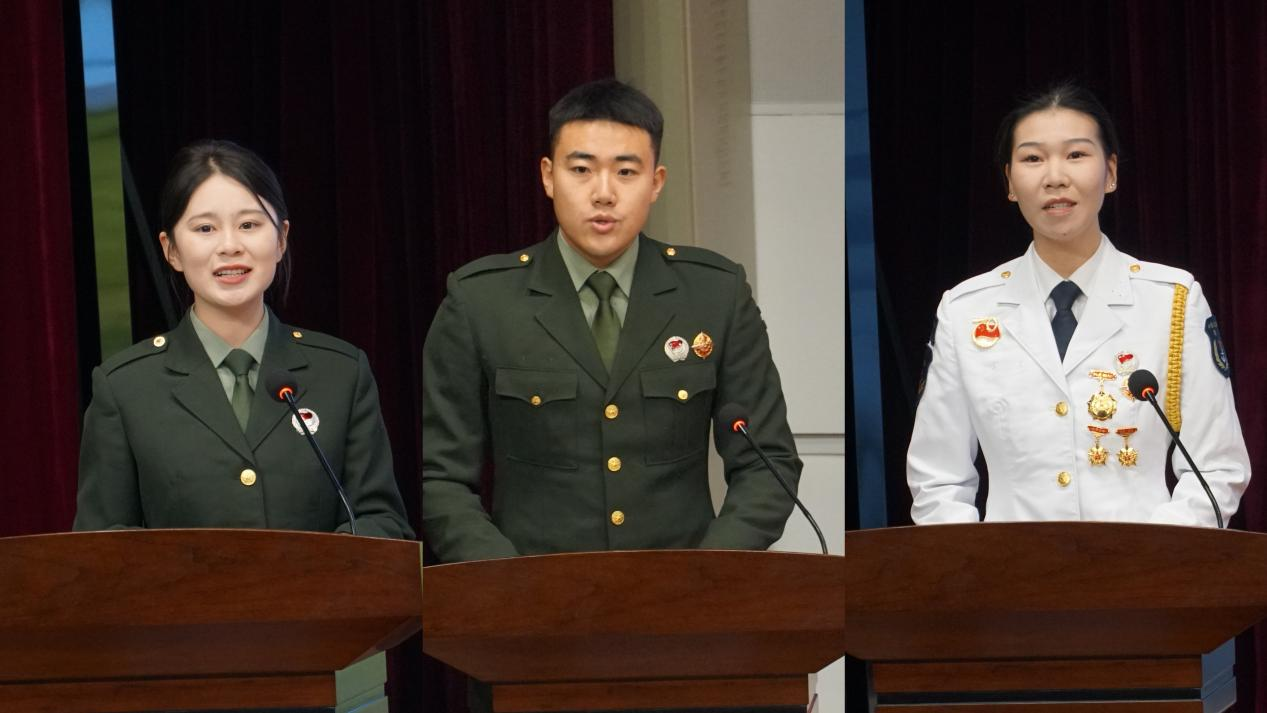 活动中,三名退役大学生士兵分享了自己的励志故事和奋斗事迹。黑龙江大学马一平讲述她从青葱校园到卫国戍边、从青涩稚嫩到奉献担当、从退役士兵到校园标兵的经历,坚守在搏击风浪中逐梦青春的故事。东北农业大学王科达,在祖父和外祖父都是退伍军人的家庭背景熏陶下,他从小就立下当兵志向,厚植从军报国的家国情怀,最终他圆梦了,服役于联勤保障部队并执行了支援保障中印边境任务。我校音乐与舞蹈学院2021级舞蹈表演专业陈清林曾于2019年参加国庆70周年阅兵,她用自己的亲身经历和实际行动感召身边的每一个人,将最美的芳华献给最爱的祖国,青春砥砺报国之志,热血铸就强军之心。