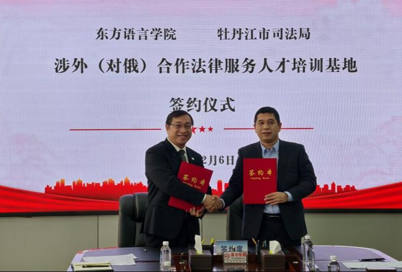 为贯彻落实习近平总书记关于加强涉外法治人才培养工作重要指示精神和我省发展涉外法律服务业的重要工作安排,推进我院“俄语+法律”复合型外语人才培养工作,助力我市创新打造“对俄合作法律服务”品牌,12月6日,东方语言学院与牡丹江市司法局在综合楼1203会议室举行了涉外(对俄)合作法律服务人才培训基地签约仪式,并就基地建设相关事项进行了研讨。牡丹江市司法局副局长王剑锋、律师工作和法律职业资格管理科科长邱学风、三级主任科员徐秀、公共法律服务管理一科顾忠铄,东方语言学院院长房国铮、党委副书记张秋实、副院长董奎玲、教科研副主任关茗竺出席了此次活动,仪式由东方语言学院副院长刘凯东主持。