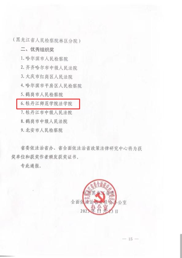 近日,中共黑龙江省委全面依法治省委员会办公室发布了《关于2023年全面依法治省优秀论文评选结果的通报》。我校喜获多项佳绩,其中一等奖1项、二等奖2项、三等奖1项、优秀奖1项,我校法学院荣获“全省优秀组织奖”。