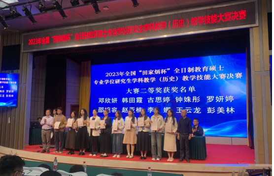 10月24日,2023年全国“田家炳杯”全日制教育硕士专业学位研究生学科教学(历史)专业教学技能大赛决赛在四川师范大学圆满落幕。我校学科教学(历史)专业2022级研究生赵亚楠荣获二等奖、张晗笑荣获三等奖,庞丽娟老师荣获“优秀指导教师奖”。