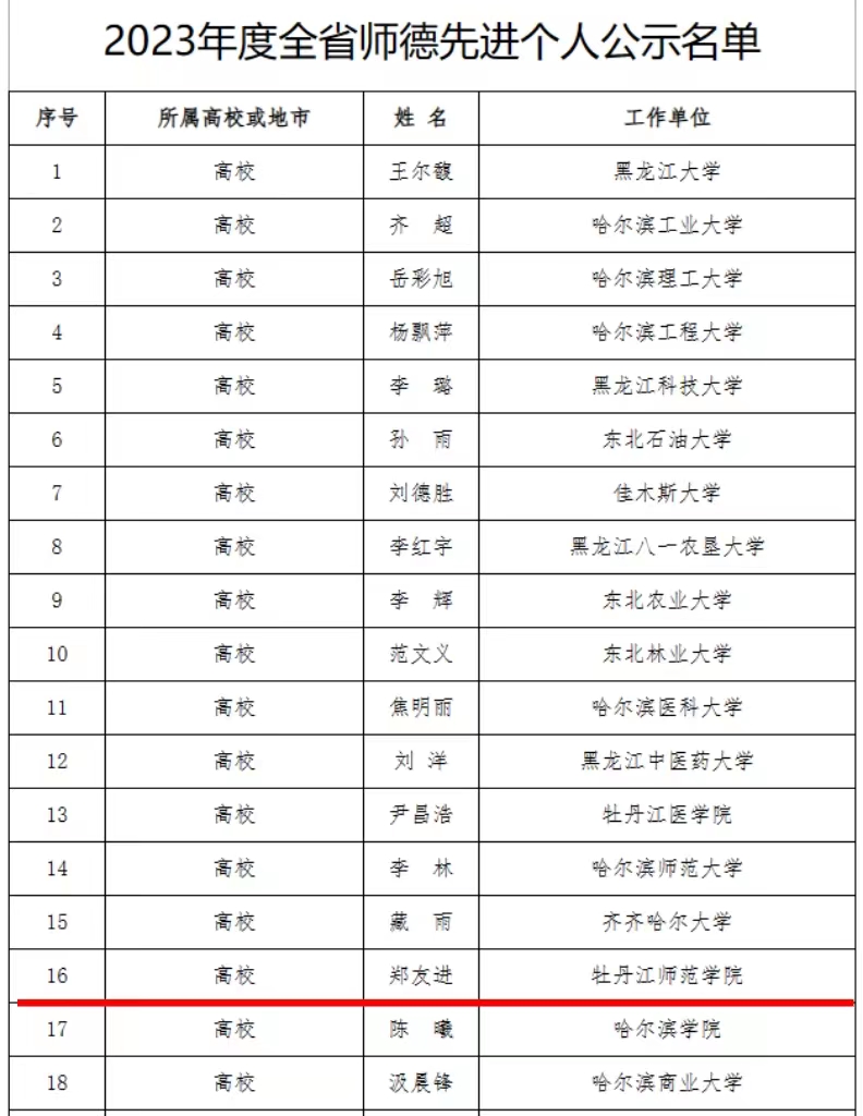 日前,黑龙江省教育厅公布了全省教育系统2023年师德先进集体和先进个人评选结果。我校数学科学学院被评为全省教育系统师德先进集体,郑友进教授被评为全省教育系统师德先进个人。