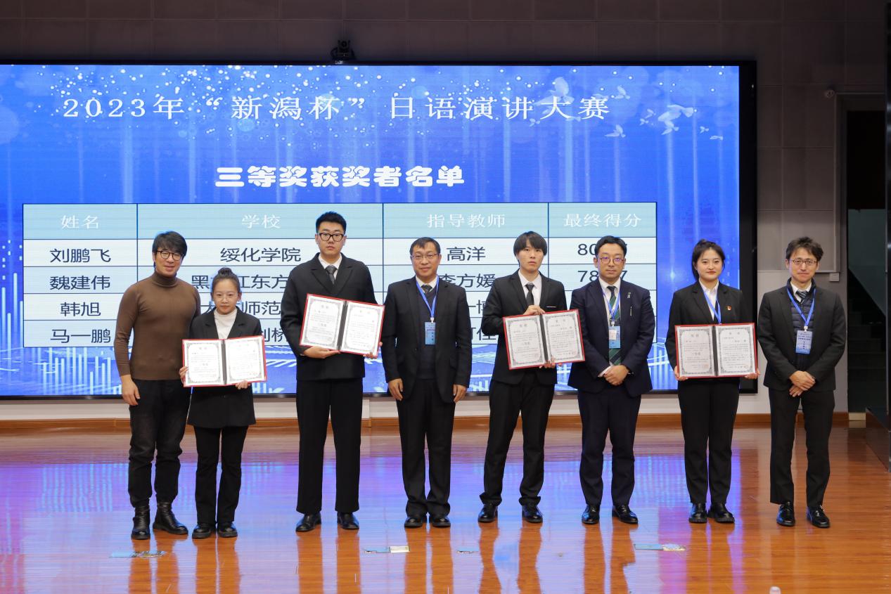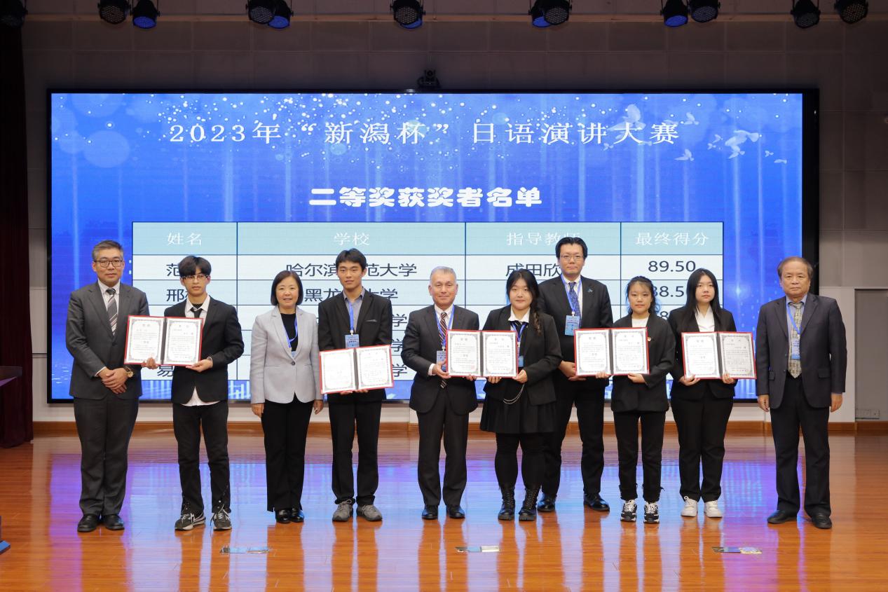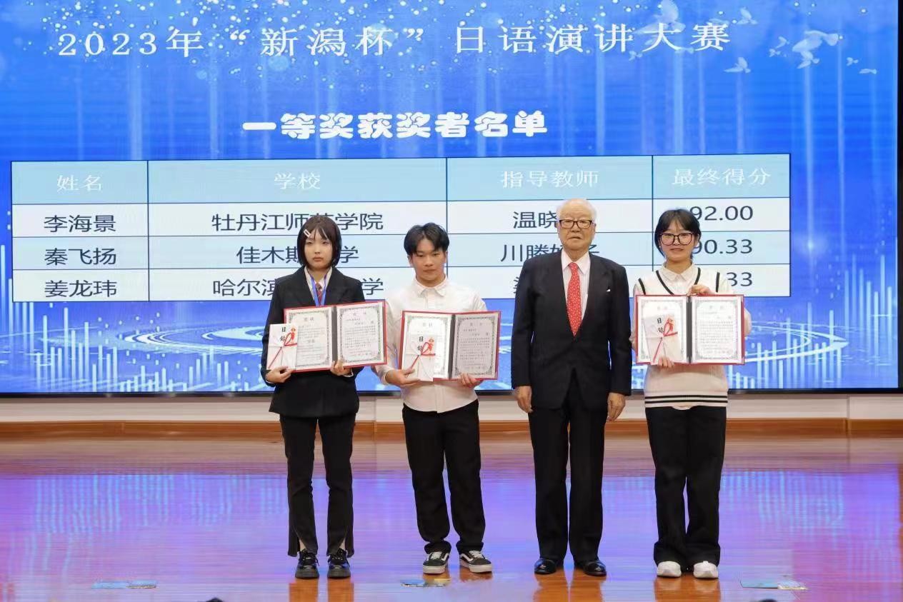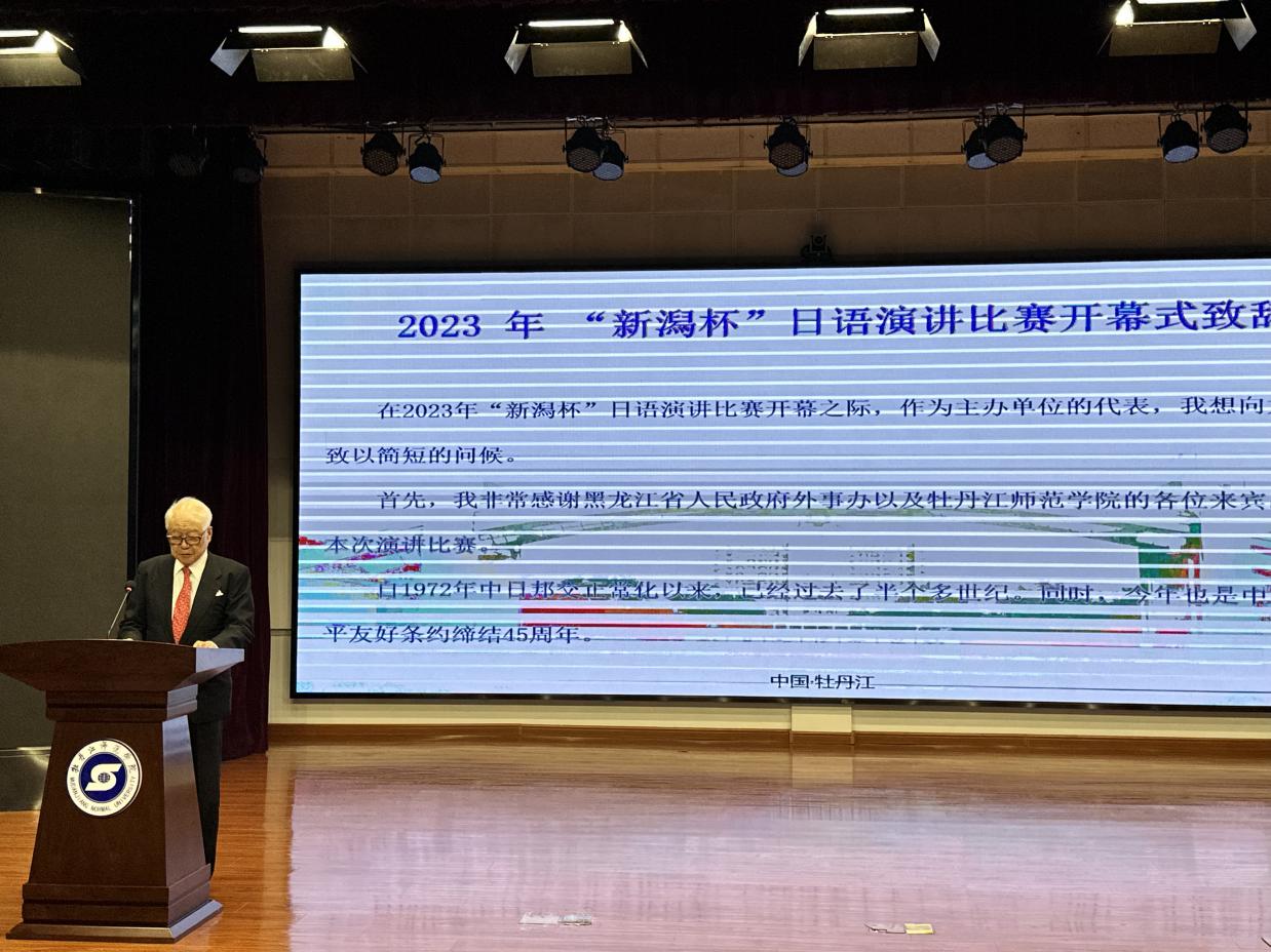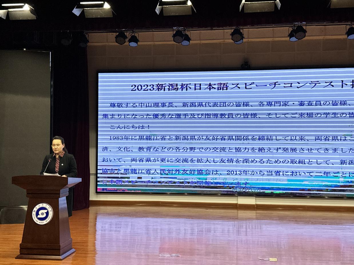 11月4日,由黑龙江省人民对外友好协会、日本新潟県国际交流协会联合主办,我校承办的2023年“新潟杯”日语演讲大赛在我校春秋讲坛成功举办。新潟県国际交流协会理事长中山辉也,黑龙江省人民政府外事办公室东北亚处副处长敬剑,中国日语教学研究会黑龙江分会会长孙颖,名誉会长陈百海,黑龙江省翻译协会秘书长朱星和,新潟県大连经济事务所邹青阳,新潟県在哈国际交流员成山义人、山根友梨奈等相关领导、专家;副院长、党委常委张艳霞及国际交流合作处、东方语言学院相关负责同志出席。