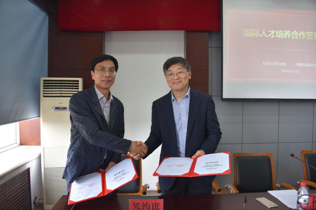 党委常委、副校长杨敬民与中国测评中心副主任韩宝成教授签订了“共建国际人才培养基地合作备忘录”