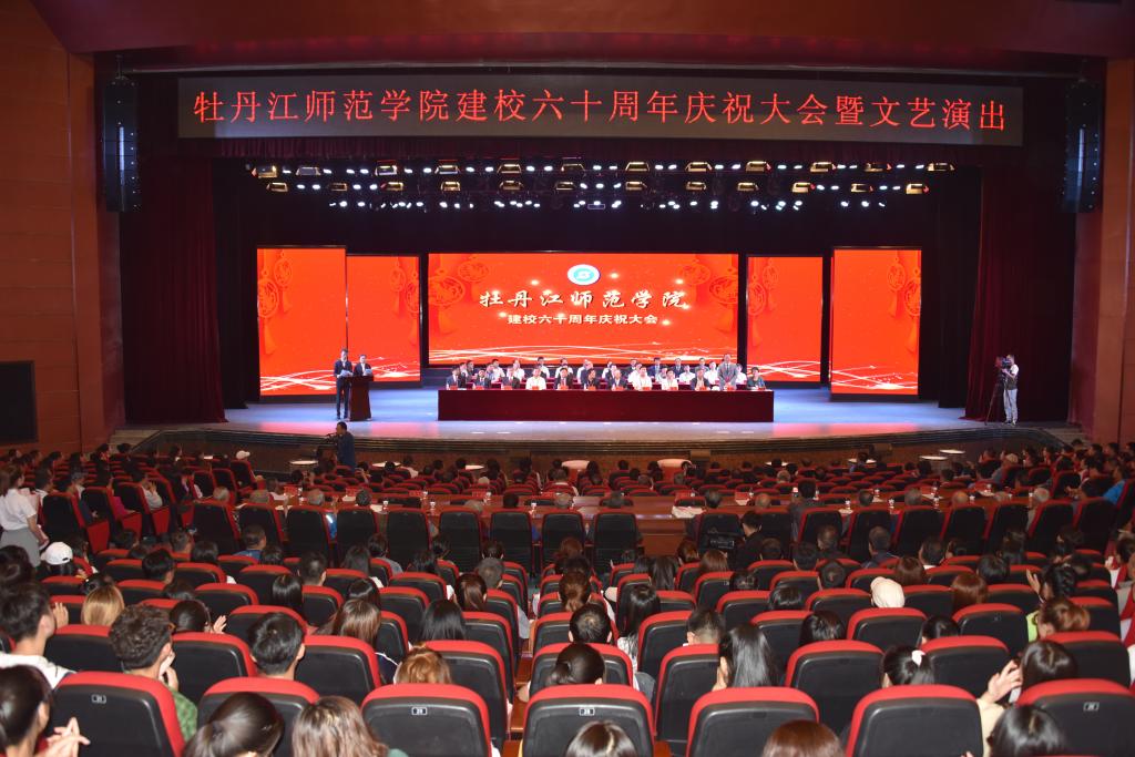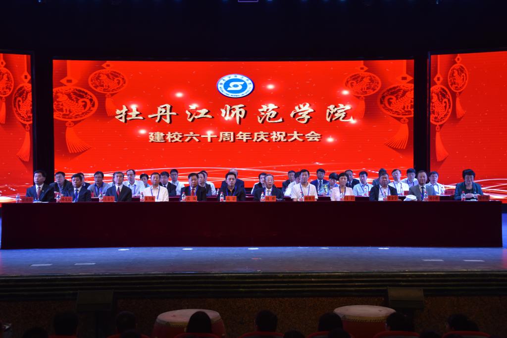9时38分,庆祝大会正式召开。牡丹江市委、市政府、市人大、市政协领导;为学校发展建设作出贡献的历届领导;省内兄弟院校哈尔滨师范大学、齐齐哈尔大学、佳木斯大学、八一农大、绥化学院、齐齐哈尔医学院、黑河学院的领导;驻牡兄弟院校牡丹江医学院、牡丹江大学、黑龙江幼儿师范高等专科学校、黑龙江林业职业技术学院、黑龙江农业经济职业学院、黑龙江商业职业学院、黑龙江技师学院的领导;支持学校发展建设的社会各界人士以及校友代表及学校现任党政领导及教师、学生代表在主席台就坐。曾在学校工作过的离退休老领导、部分学校老教师、老工人代表一同参加庆祝大会。关心学校发展建设的社会各界朋友、各级校友和全校师生员工共计1500余人参加庆祝大会。庆祝大会由校党委书记王育伟主持。