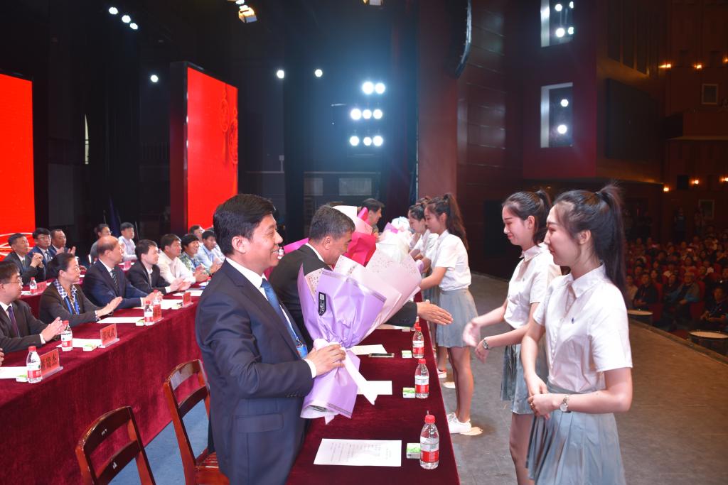 庆祝大会在雄壮的国歌声中拉开帷幕。首先,大学生们将手中的鲜花献给了与学校同成长、共命运,将自己的青春奉献给了学校,无怨无悔;将自己的一生奉献给了学校,始终不渝;伴随着学校的发展,经历了学校发展的艰辛与曲折,见证了学校的成就与辉煌的老领导、老教授、老工人们。两鬓斑白的老同志们从青春阳光的大学生们手中接过一束束鲜花,接受年青一代学子对老一辈人的诚挚谢意!