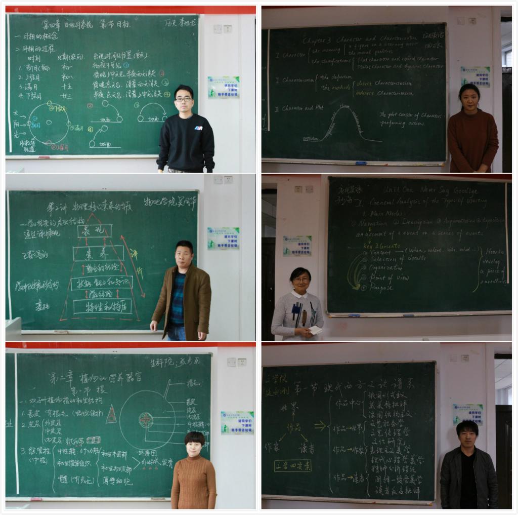 参赛老师们板书设计科学合理,布局主次分明,书写有力隽永、美观大方,板图板画准确工整、形象生动……得到评委老师和学生的普遍赞誉。经过激烈的角逐,共评选一等奖6项,二等奖12项,优秀奖15项,文学院延永刚、应用英语学院曲冰、应用英语学院孙海一荣获文科组一等奖,物理与电子工程学院吴同华、历史与文化学院李旭龙(地理专业)、生命科学与技术学院张彦丽荣获理科组一等奖,评审专家在现场对一等奖获奖作品进行了点评。