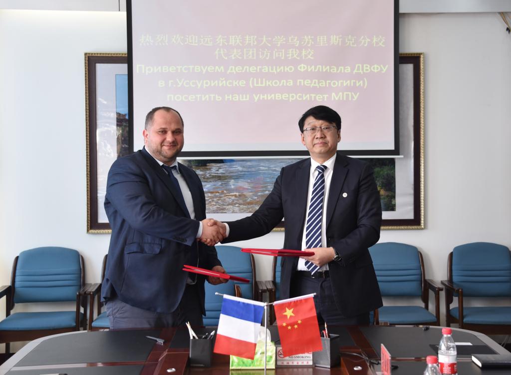 远东联邦大学乌苏里斯克分校代表对我校的热情接待表示感谢,并表示高度重视与我校的合作与交流,期待两校间建立长期友好的合作关系。同时,诚挚地邀请我校师生及科研人员赴远东联邦大学乌苏里斯克分校进行学习和交流。随后,李旭中副校长和克留金·阿尔焦姆·康斯坦丁诺维奇副校长签署了短期实习协议,并合影留念。