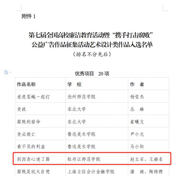 日前,教育部办公厅公布《第七届全国高校廉洁教育活动暨“携手打击腐败”公益广告作品征集活动结果的通知》(教思政厅函[2020]3号),我校美术与设计学院教师赵立石、王赫名的作品《别因贪心迷了路》入选优秀项目。