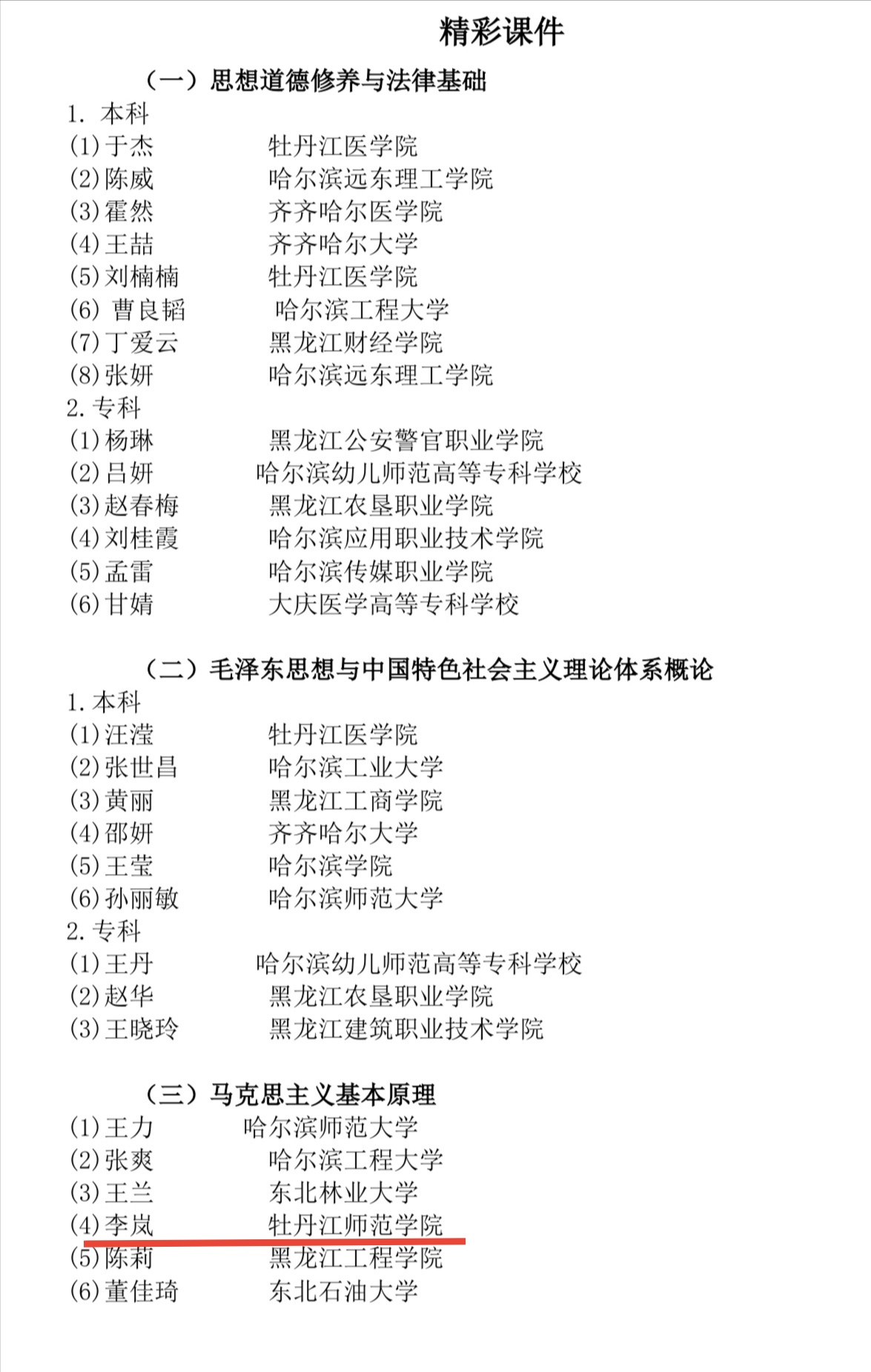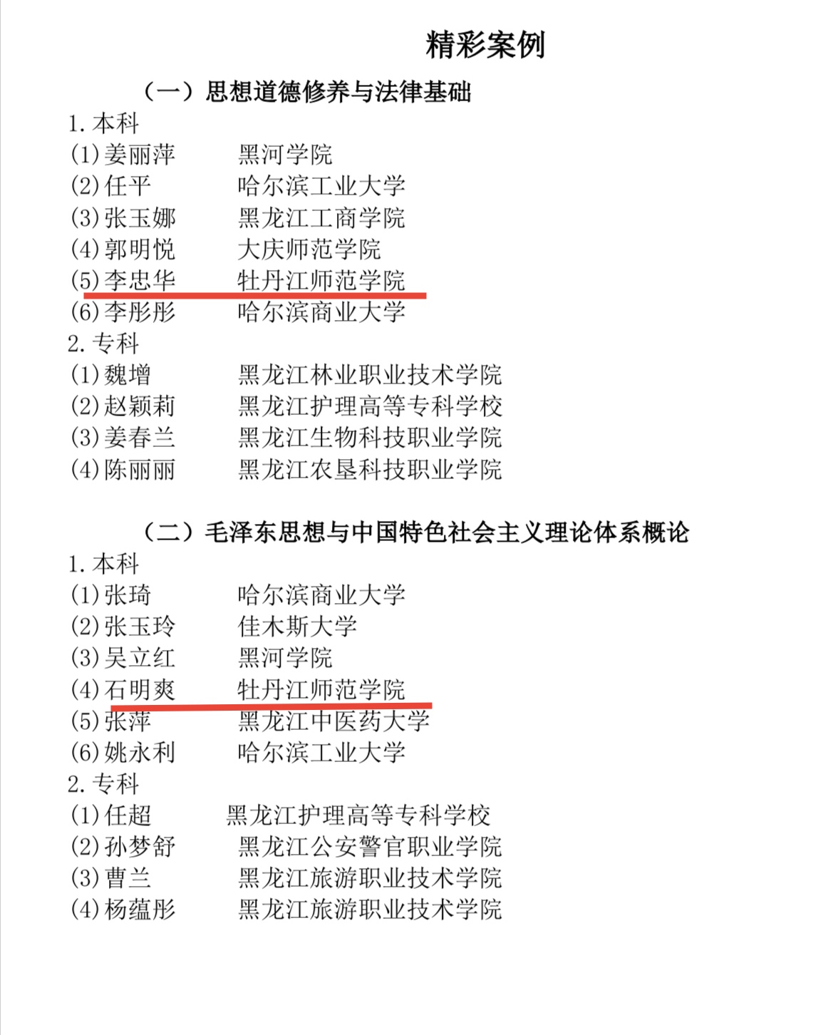 日前,黑龙江省教育厅公布2019年全省高校思想政治理论课“精彩系列”教学成果获奖名单,我校马克思主义学院教师李忠华、石明爽分获“思想道德修养和法律基础”课程和“毛泽东思想和中国特色社会主义理论体系概论”课程“精彩案例”奖;马克思主义学院教师李岚荣获“马克思主义基本原理”课程“精彩课件”奖。