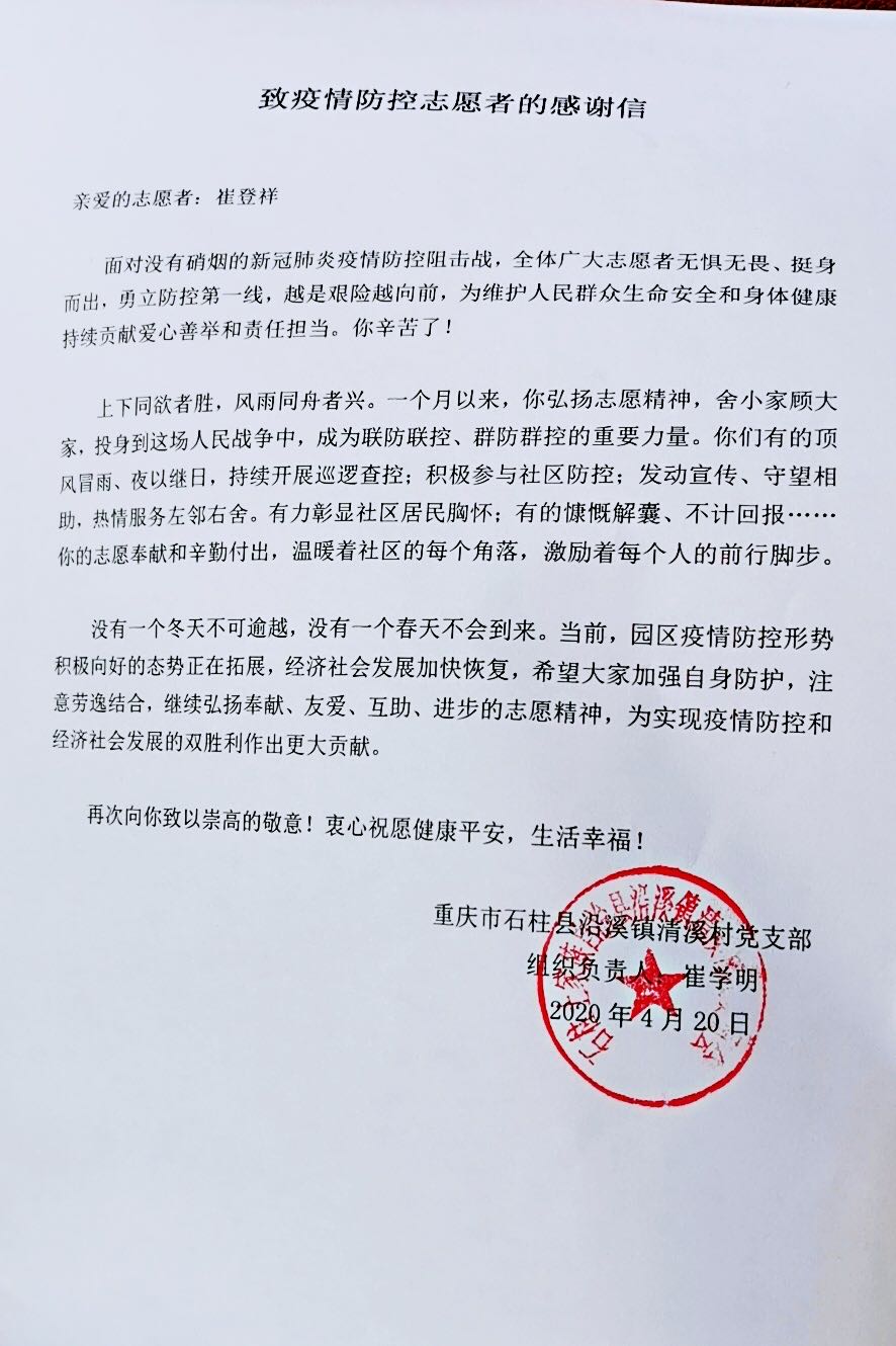 音乐与舞蹈学院学生党员崔登祥舍小家顾大家,投身到重庆市石柱县清溪村的抗疫工作中,发动宣传、守望相助、热情服务村民,为村民送去温暖,成为了防控工作的重要力量。