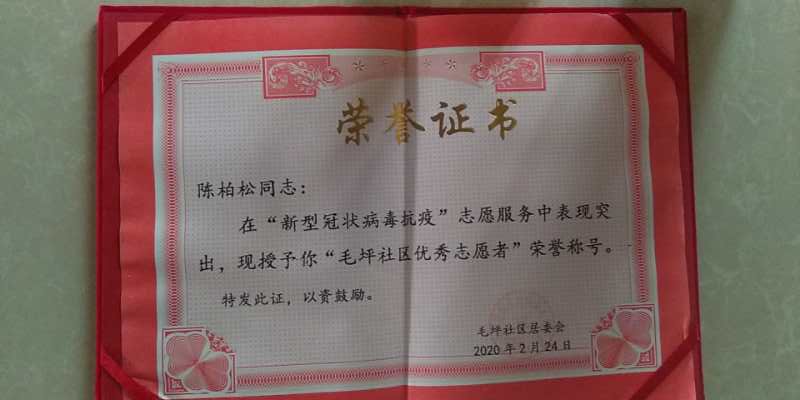 经济与管理学院学生党员陈柏松放弃了假期休息时间,主动报名参与遵义市播州区毛坪社区疫情防控工作,作为志愿者坚守防控卡口,对来往车辆和人员进行查验、劝返,得到了当地社区工作人员的一致肯定和赞扬,并获得毛坪社区颁发的“优秀志愿者”荣誉称号。