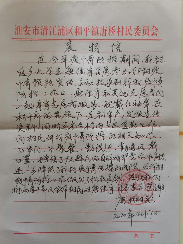 美术与设计学院学生党员唐佳宇,疫情防控期间投身于淮安市和平镇唐桥村的志愿服务工作中。卡点执勤、宣讲抗疫知识,工作一丝不苟,为防控工作做出了积极贡献。