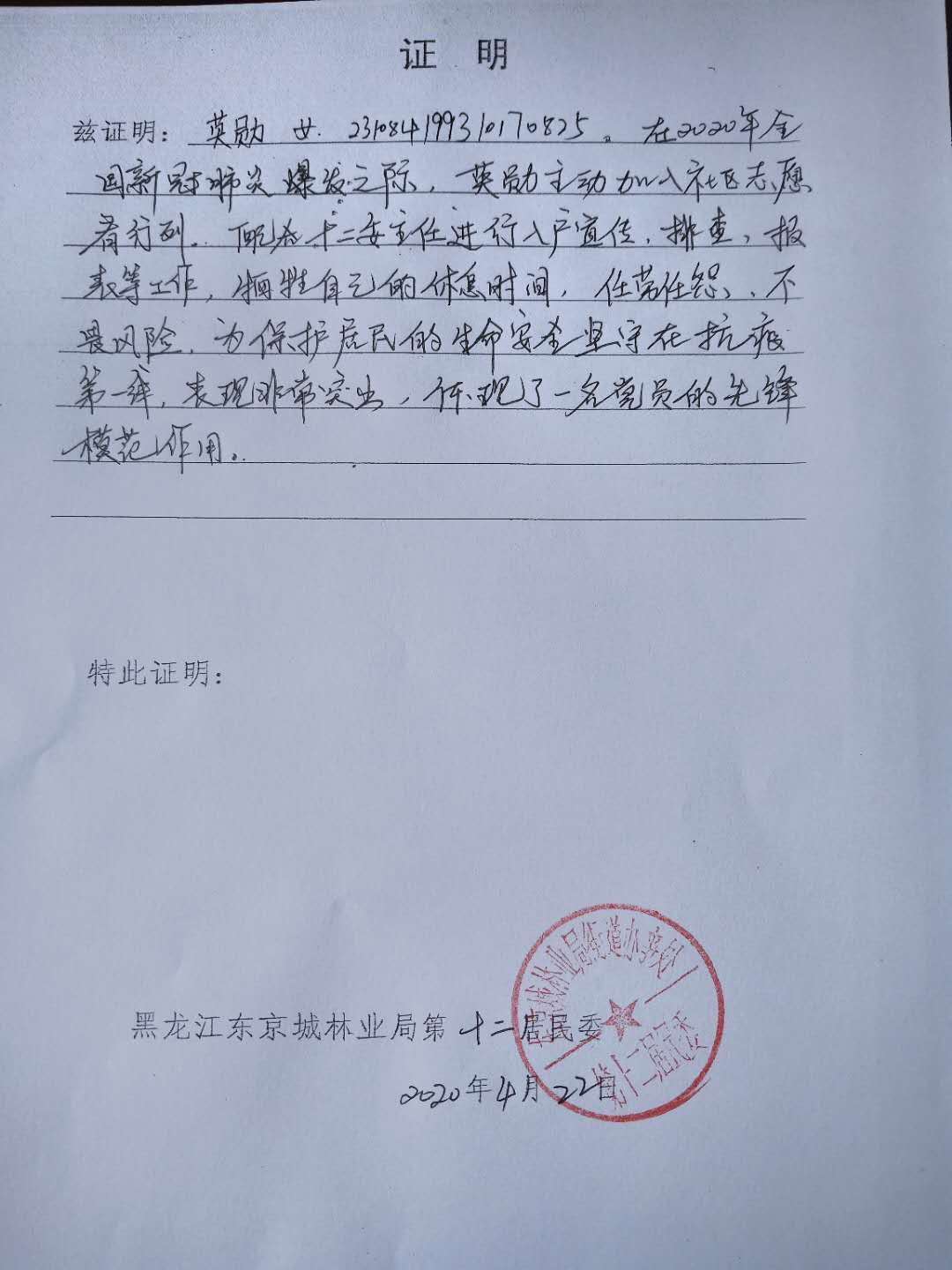 应用英语学院研究生学生党员英勋在疫情面前没有选择安逸宅家,而是主动加入东京城林业局街道办事处志愿者行列,入户宣传防疫知识、排查居民健康情况、整理各类信息报表,不畏艰险、任劳任怨。