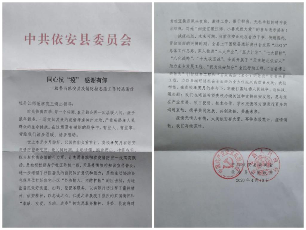 疫情发生以来,学校党委第一时间发布了《关于进一步加强党的领导,为打赢疫情防控阻击战提供坚强政治保证的工作要求》,我校师生党员坚决响应党的号召,主动亮身份、争先锋、做表率,积极参与各地基层党组织、社区疫情防控工作,做出了突出贡献。近日,学校各基层党组织收到了来自牡丹江、哈尔滨、齐齐哈尔、大庆、淮安等多地党组织、团委、社区、村委会等对学校的感谢和对师生党员志愿者的表扬,其中感谢信及表扬信7封,获相关荣誉证书6人。