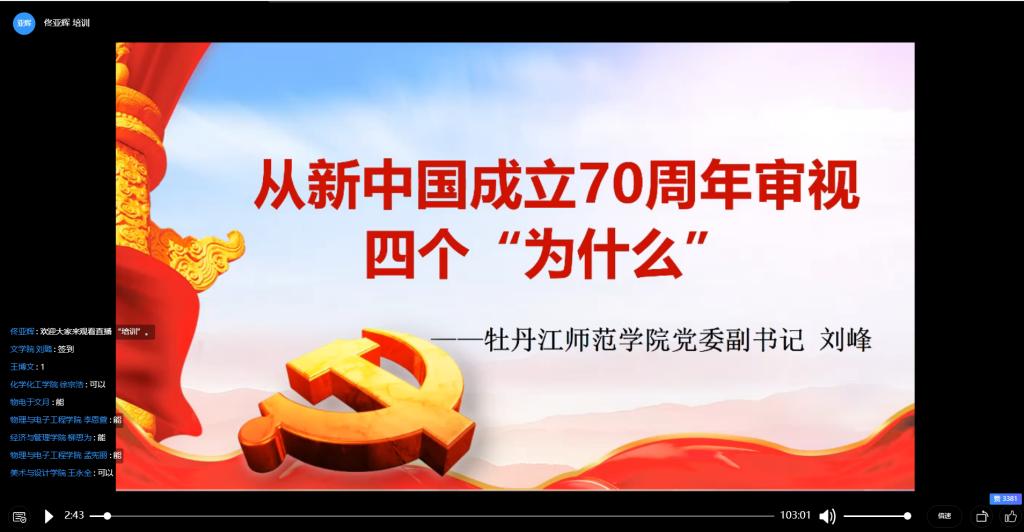 校党委党校、组织部根据培训班学员特点,精心设计了培训课程。培训班上,学校党委副书记刘峰以《从新中国成立70周年审视四个“为什么”》为题,结合自己的学习感悟为学员呈现了一堂深入浅出、精彩纷呈的专题党课辅导。课上,刘峰书记用深刻精辟的语言,通过运用大量的数据和事实向学员阐释了“马克思主义为什么行?中国共产党为什么能?中国特色社会主义为什么好?中华民族伟大复兴为什么近?”四个方面内容,环环相扣,层层深入。参训学员纷纷表示,本次党课立意深刻、站位高远、受益匪浅,通过刘书记的讲授,各位学员将进一步坚定共产主义理想信念,以自身实际行动为实现中华民族伟大复兴不懈奋斗。