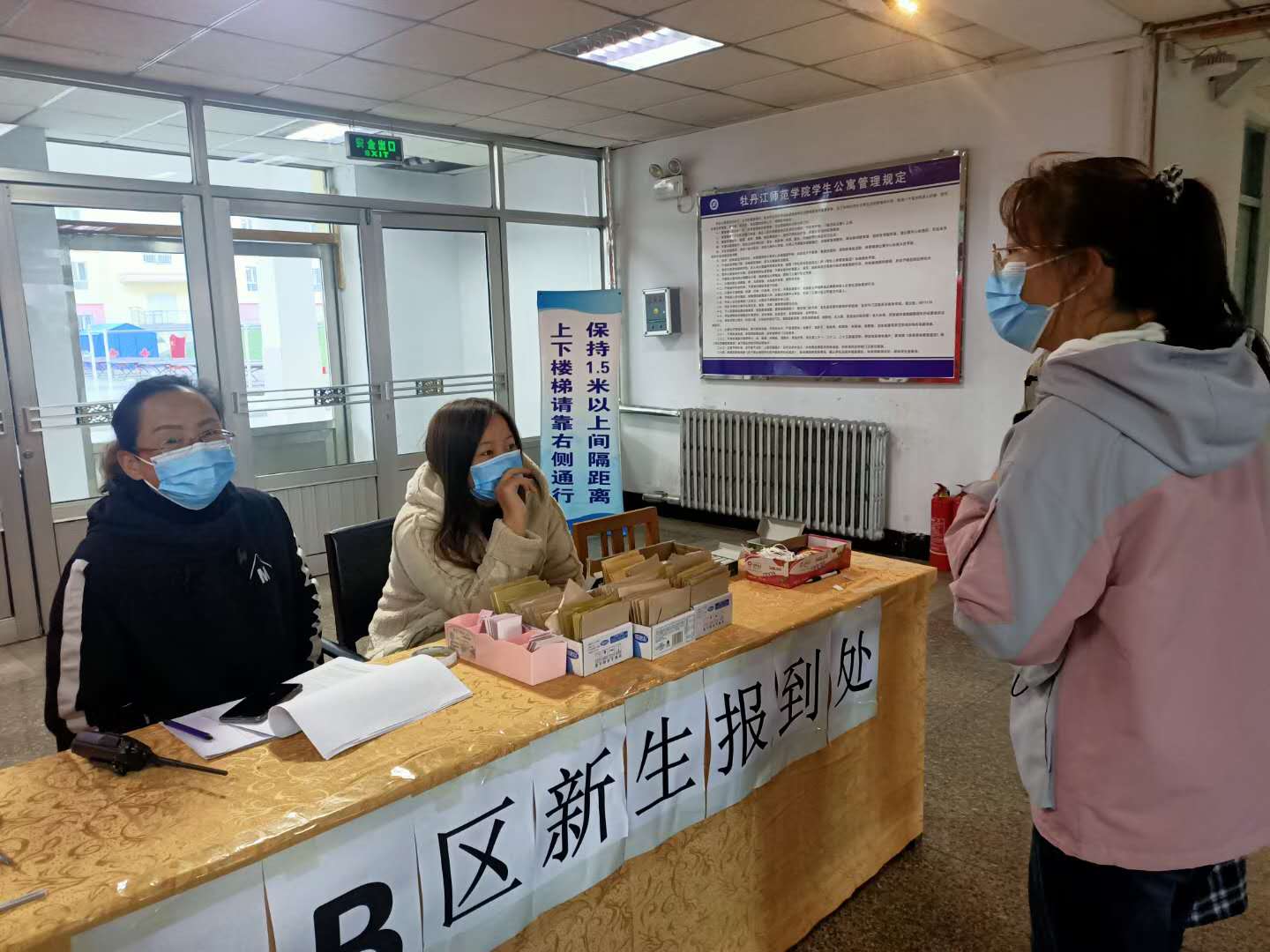 在隔离等待区,校团委选派了20名志愿者,为同学们安排了校史宣讲、安全知识普及、校歌学唱等活动内容,让同学们的等待时光不枯燥,也安抚了他们刚刚离开家长的不安,使他们感受到了师院大家庭的温暖。