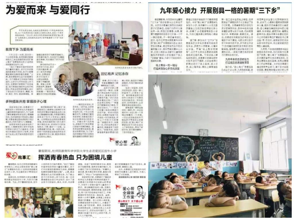 该项目依托教育科学学院“教心育才”志愿服务队,通过募有责任心,有爱心,有意向通过自己的努力服务社会、服务他人的师范专业大学生,发挥师范专业学生智力优势和群体优势,利用课余时间及寒暑假,深入小学、社区、农村,为弱势儿童进行学习指导和心理辅导。通过大学生与弱势儿童多种方式的交流和影响,提高弱势儿童的个人能力、生存能力、交际能力、创新能力及为地区经济发展服务的能力。