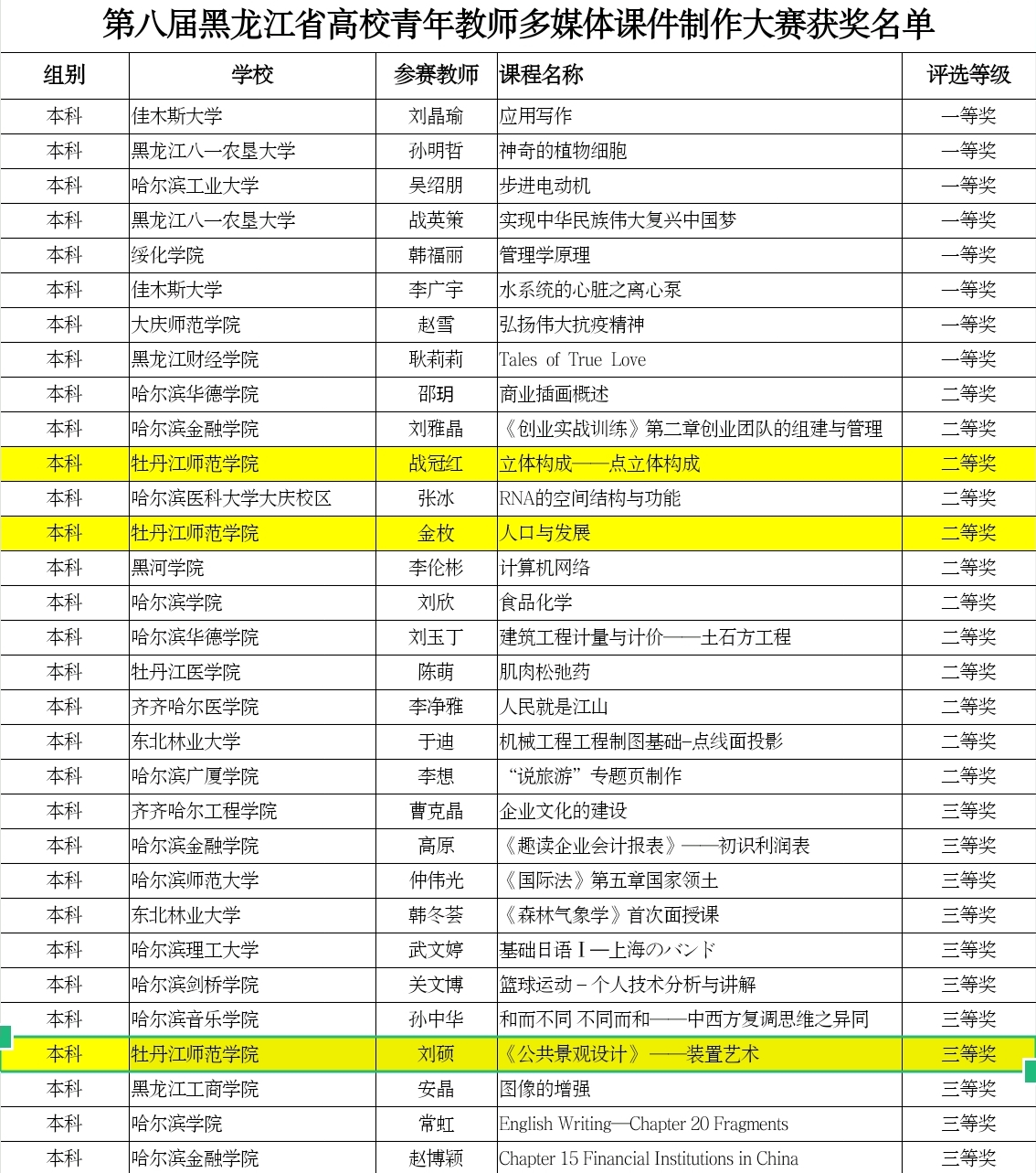 近日,黑龙江省高师培训中心公布了“第八届黑龙江省高校微课教学比赛获奖名单”,我校文学院教师李莹的作品《杜甫<登高>的家国情怀》荣获微课教学比赛本科组一等奖,美术与设计学院刘爽老师的作品《汉<乙瑛碑>及其笔法》、文学院董慧老师的作品《“寻根小说”:寻找民族文化之根》荣获微课教学比赛本科组二等奖;美术与设计学院战冠红老师的作品《立体构成——点立体构成》、历史与文化学院金玫老师的作品《人口与发展》荣获青年教师多媒体课件制作大赛本科组二等奖,美术与设计学院刘硕老师的作品《公共景观设计——装置艺术》荣获青年教师多媒体课件制作大赛本科组三等奖。我校荣获“第八届黑龙江省高校微课教学比赛优秀组织奖”。