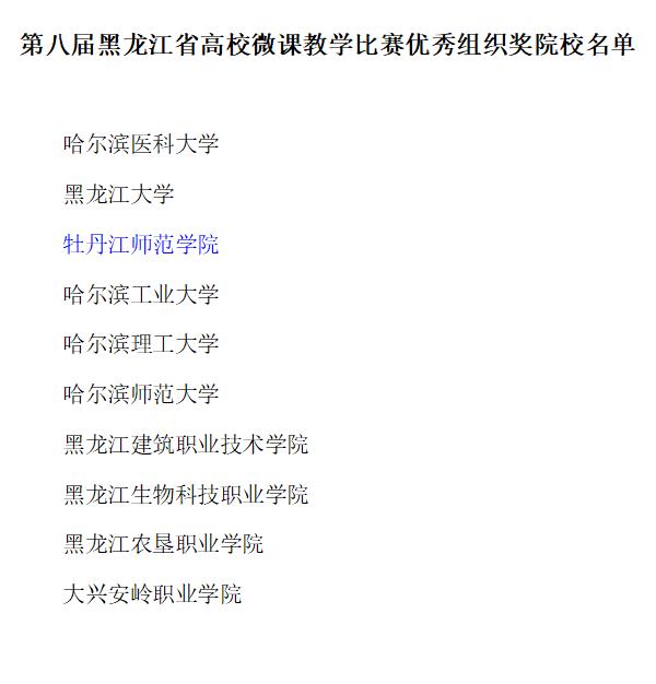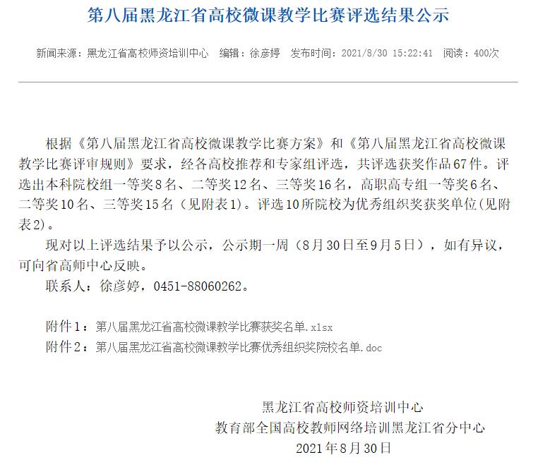 据悉,黑龙江省高校微课教学比赛是经省教育厅批准,由黑龙江省高校师资培训中心和教育部全国高校教师网络培训黑龙江省分中心联合举办。高校微课教学比赛旨在贯彻落实《中央国务院关于全面深化新时代教师队伍建设改革的意见》精神,推动高校教师专业发展和教学能力提升,为高校教师教学经验交流和教学风采展示搭建平台。
