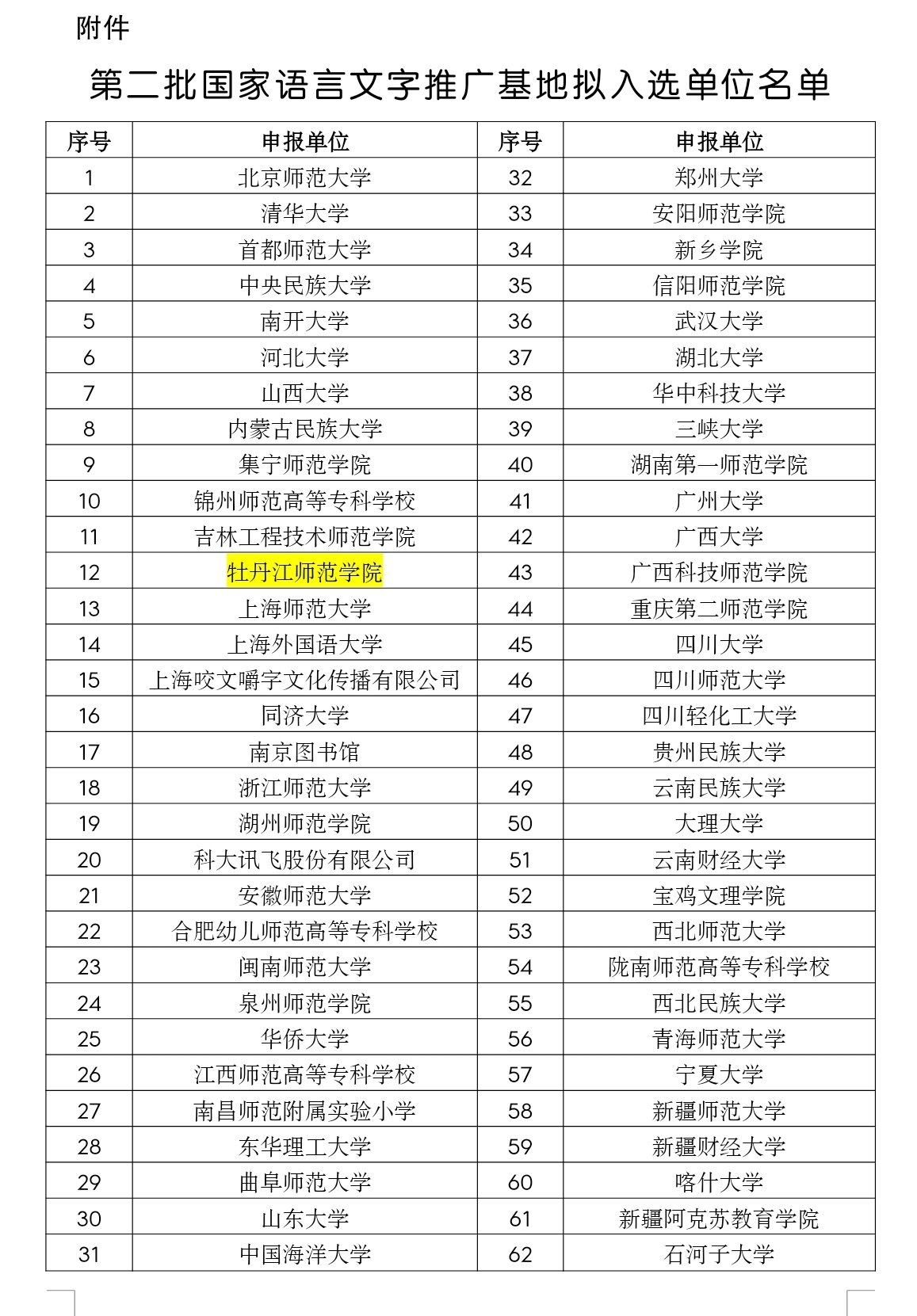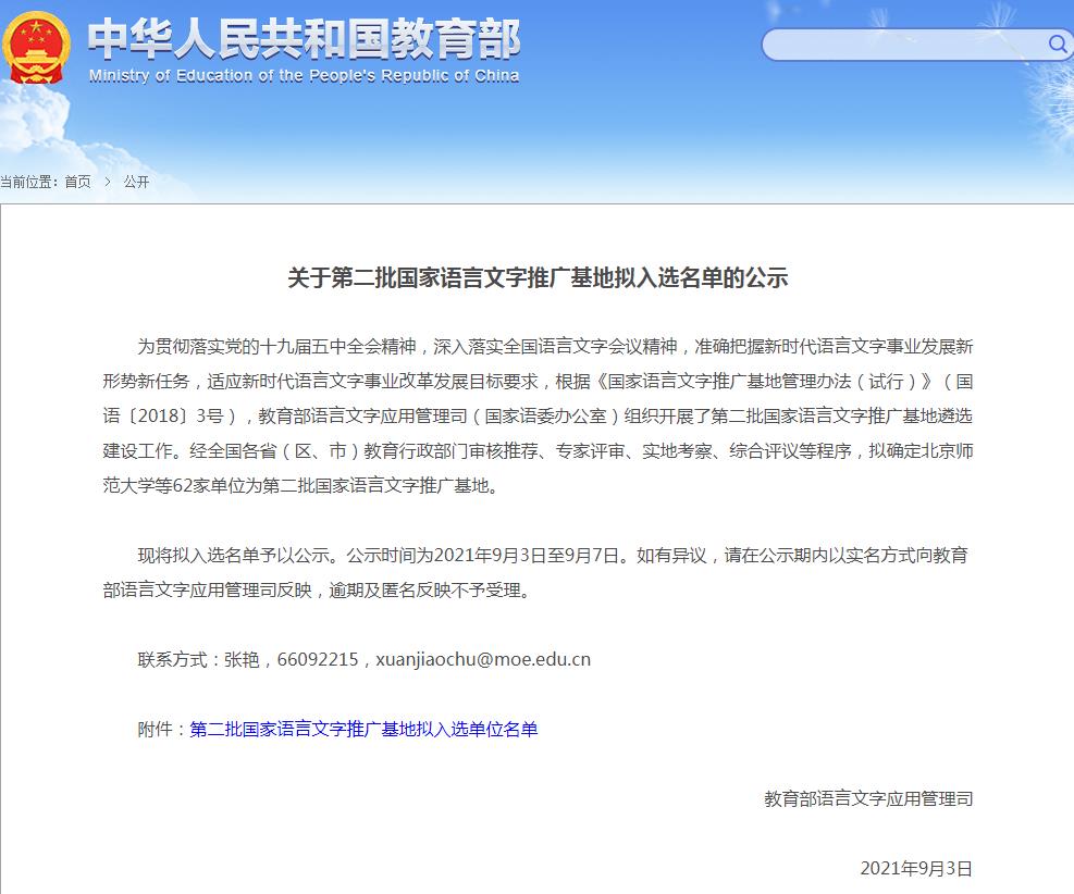 9月3日,教育部公布了第二批“国家语言文字推广基地”名单。我校与清华大学、山东大学、武汉大学、北京师范大学等62所高校共同入选,成功获批教育部“国家语言文字推广基地”,是本次黑龙江省唯一一所入选高校。