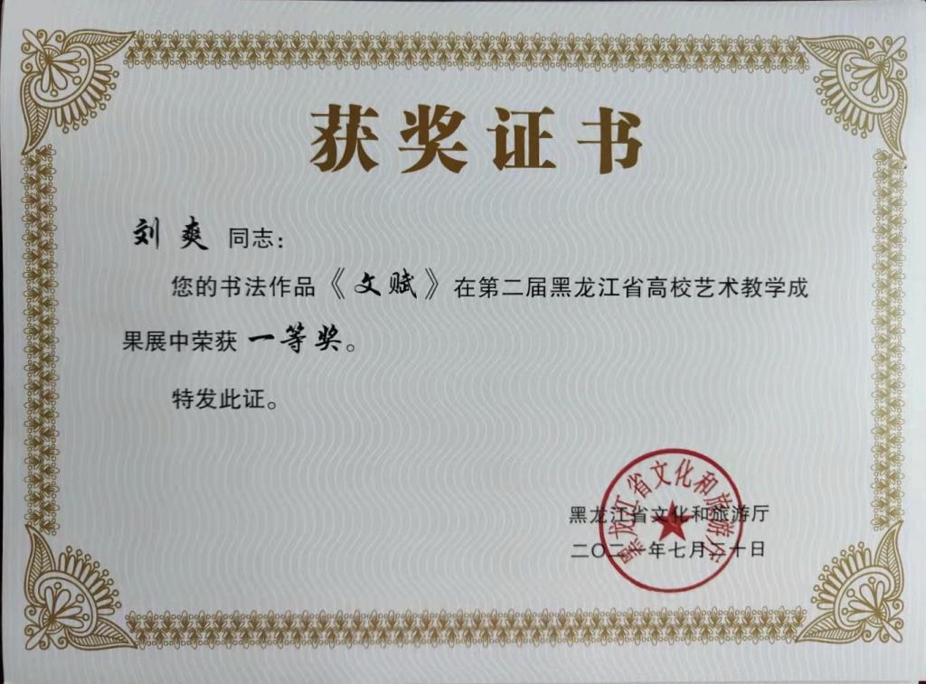 我校积极组织师生参加,共创作作品187件,经学校组织专家评审,择优推荐参展作品36件。经由省内外专家组成的评审委员会评比选拔,美术与设计学院教师刘爽的书法作品《文赋》荣获第二届黑龙江省高校艺术教学成果展一等奖;美术与设计学院教师战冠红指导的设计作品《东北抗联展馆设计院》荣获第二届黑龙江省高校艺术教学成果展二等奖,战冠红荣获优秀指导教师二等奖;美术与设计学院教师潘驰宇、李传刚,学生杨哲、王法睿等9人荣获第二届黑龙江省高校艺术教学成果展三等奖9项。