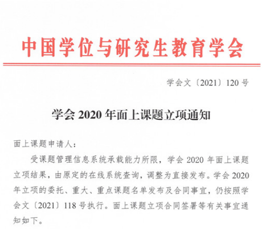 近日,中国学位与研究生教育学会发布《学会2020年面上课题立项通知》,我校研究生学院负责的《立德树人背景下“3+3”研究生导师培训体系构建与探索》项目立项获批。