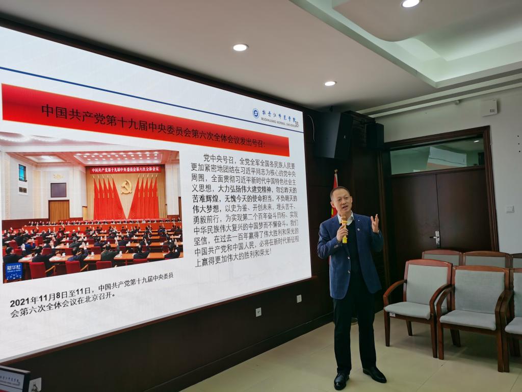李春江院长以《青年的使命担当——纪念一二∙九运动86周年》为题,以党的十九届六中全会胜利召开为切入点,讲述了中国共产党从诞生到走向成熟的百年奋斗伟大历程和中国共产党带领人民取得的举世瞩目的伟大成就。李春江院长通过讲述一二∙九运动的背景、意义以及新时代楷模的先进事迹,引发了同学们热爱祖国、为国奋斗的强烈共鸣。
