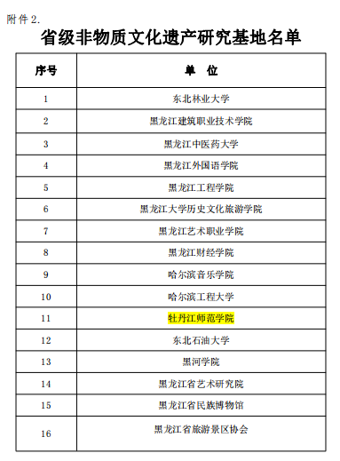 近日,黑龙江省文化和旅游厅公布了“黑龙江省非物质文化遗产教育基地和研究基地认定结果”。我校获批“省级非物质文化遗产研究基地”,这是我校继2017年获批黑龙江省文化和旅游厅“黑龙江省首届非物质文化教育基地”、2019年获批文化和旅游部、教育部、人力资源和社会保障部“中国非物质文化遗产研修研习培训计划参与院校”的基础上,在非遗工作中取得的又一重大进展。