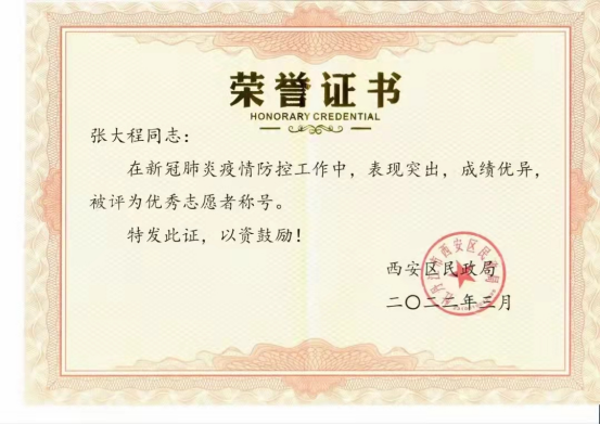 近日,学校收到一封来自牡丹江市西安区民政局的表彰函,对我校历史与文化学院张大程同志参加重点防控行业养老机构的抗疫志愿服务工作给予充分肯定。张大程同志积极肯干、吃苦耐劳、表现优异,充分展现了新时代青年干部的风采,树立了牡师院教师有责任、敢担当的形象。