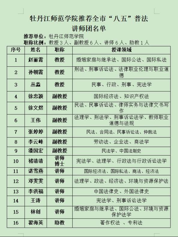 近日,中共牡丹江市委全面依法治市委员会守法普法协调小组、牡丹江市法学会、牡丹江市司法局联合发布了《关于成立全市“八五”普法讲师团的通知》。我校法学院赵丽霞、孙朝霞、丛淼、徐忠颖、徐文煜、王伟、张婷婷、李云峰、潘国宏、褚清清、谌雪燕、邓雯雯、李洪福、王涛、林创、翟海英等16名教师入选牡丹江市“八五”普法讲师团。