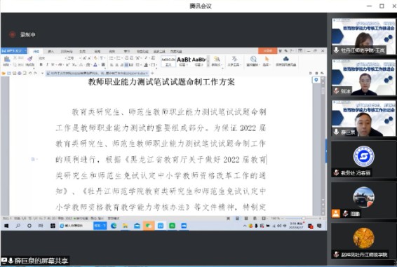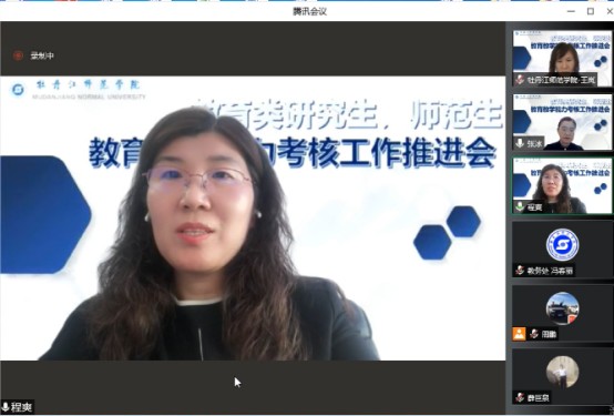副院长、党委常委程爽在会上讲话。她指出,教育类研究生和师范生免试认定中小学教师资格是教育领域“放管服”改革、规范师范类专业建设的重要举措,也是我校深化教师教育改革、提升师范人才培养质量的重要契机,更是关系学生切身利益与未来职业选择和发展的大事。程爽副院长就线上考核工作提出三点要求:一是高度重视、聚焦重点。各二级学院、相关职能部门要高度重视,广泛宣传、上下联动、密切配合,确保免试认定各项工作高效有序推进;二是充分准备、做好预案。提前研判报名、笔试、面试等环节中可能出现的各种情况,做好应急预案和解决措施;三是严肃纪律、公平公正。对于考核过程中玩忽职守、徇私舞弊的单位和个人,追究责任并依法依规严肃处理。程爽副院长强调,全校要以此次免试认定为契机,调整优化人才培养方案,强化师范生培养过程与评价改革,推动我校教师教育内涵式高质量发展。