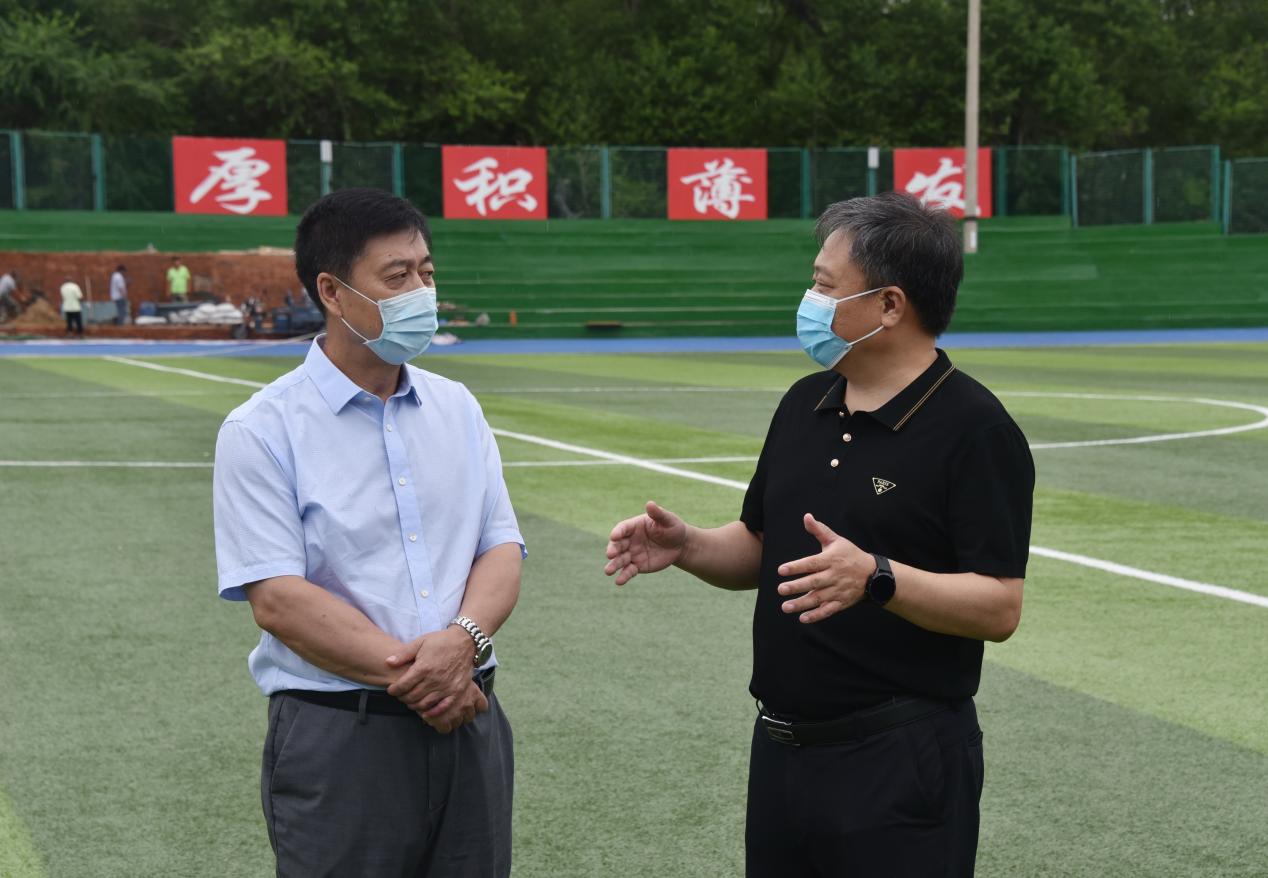 殷昌波书记一行重点考察了学校田径场,实地了解了田径场建设、维护、安全措施及日常管理等情况,并针对田径场建设存在的问题和改进措施进行现场检查指导。